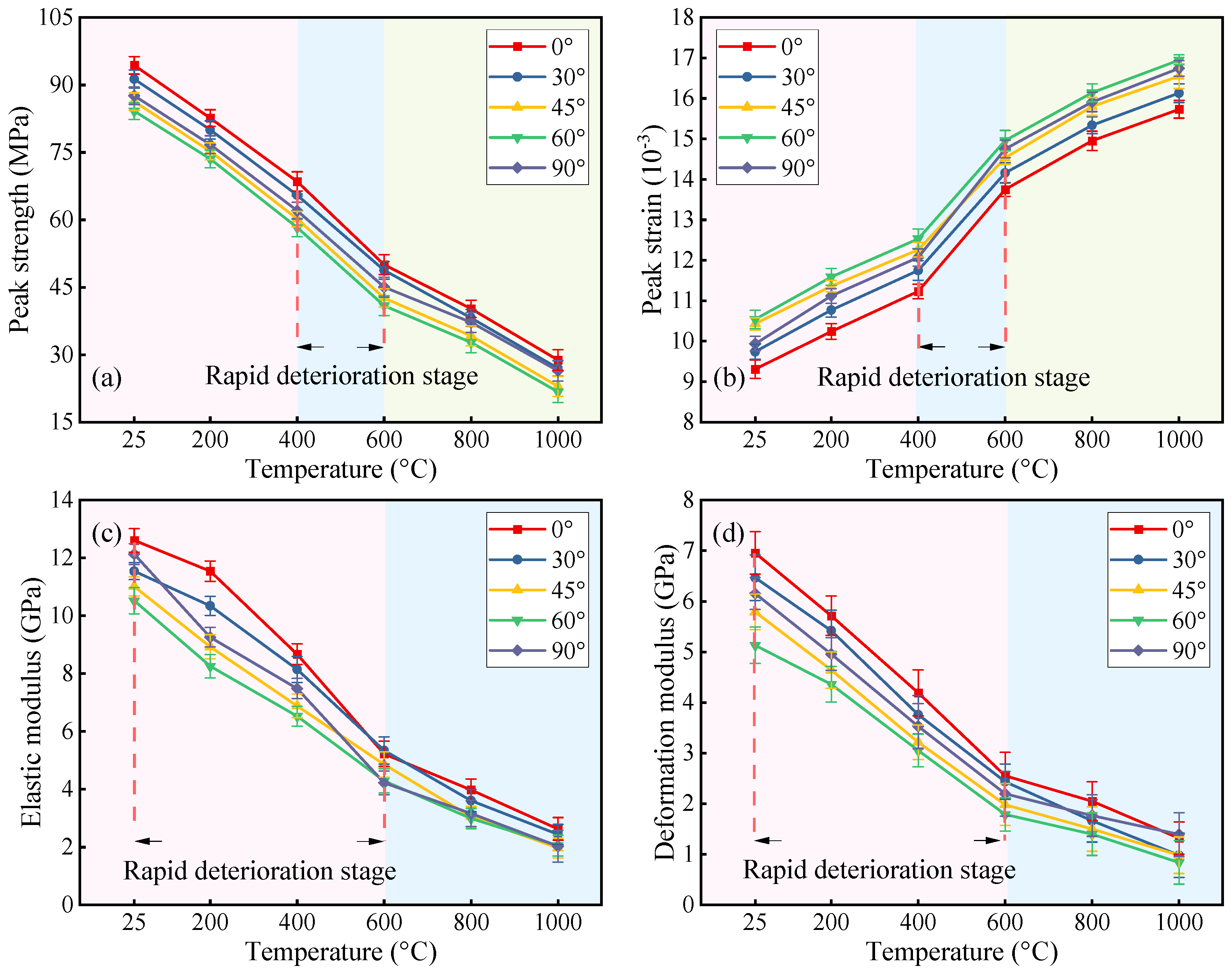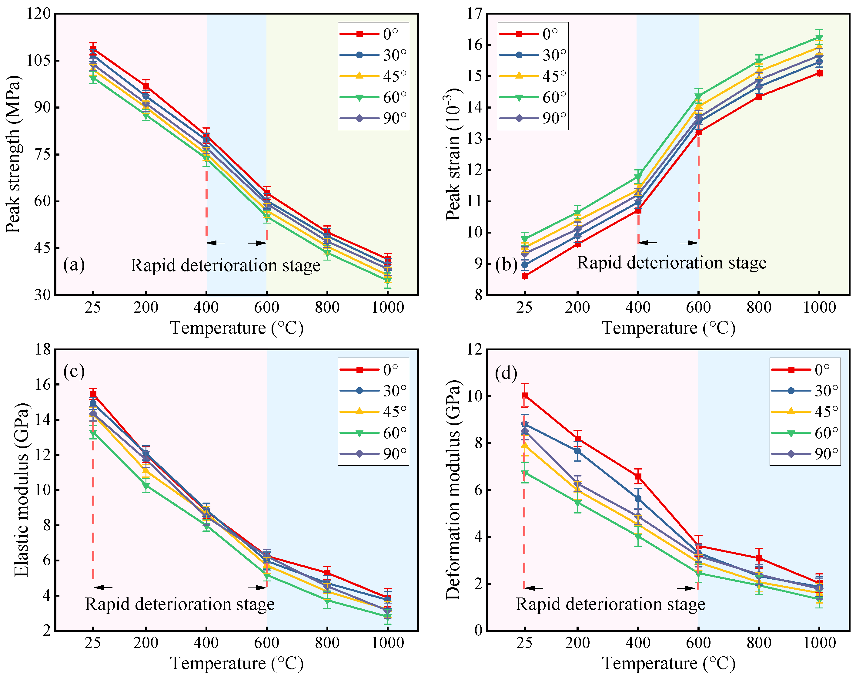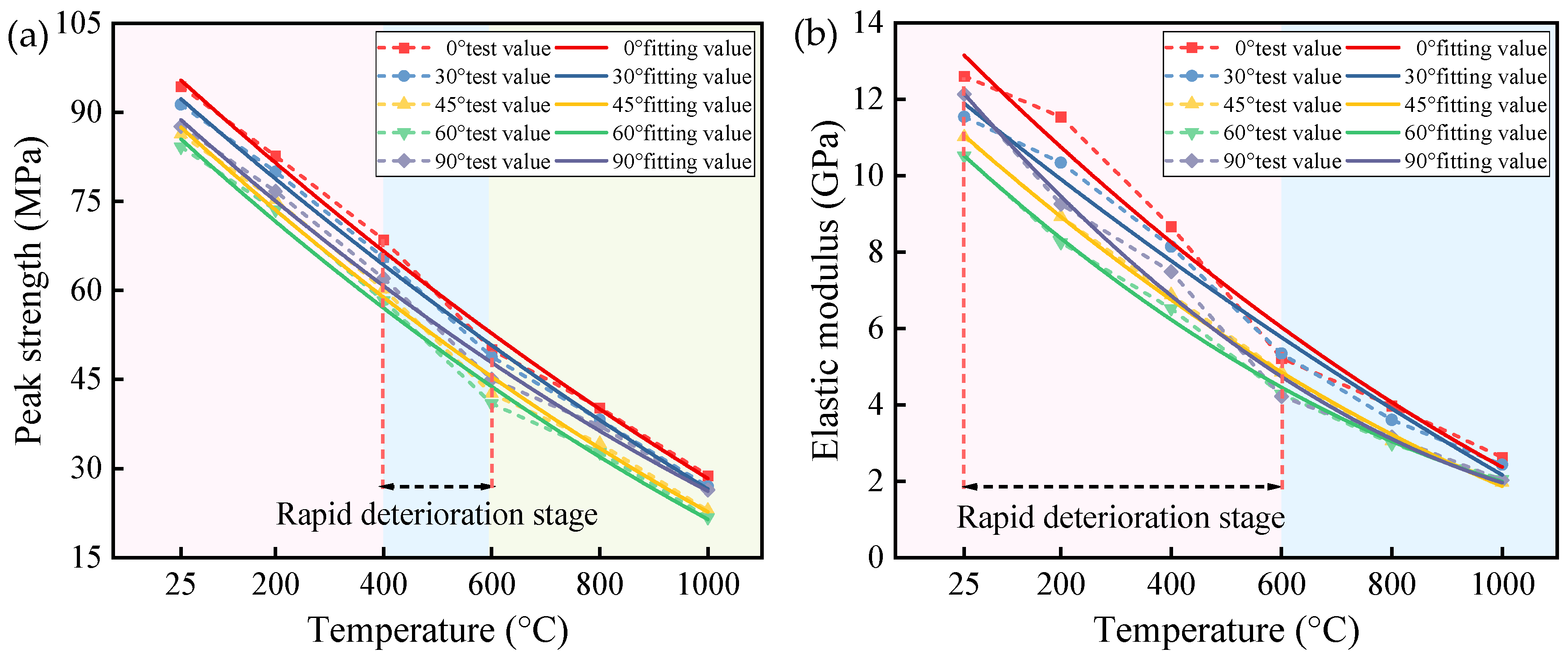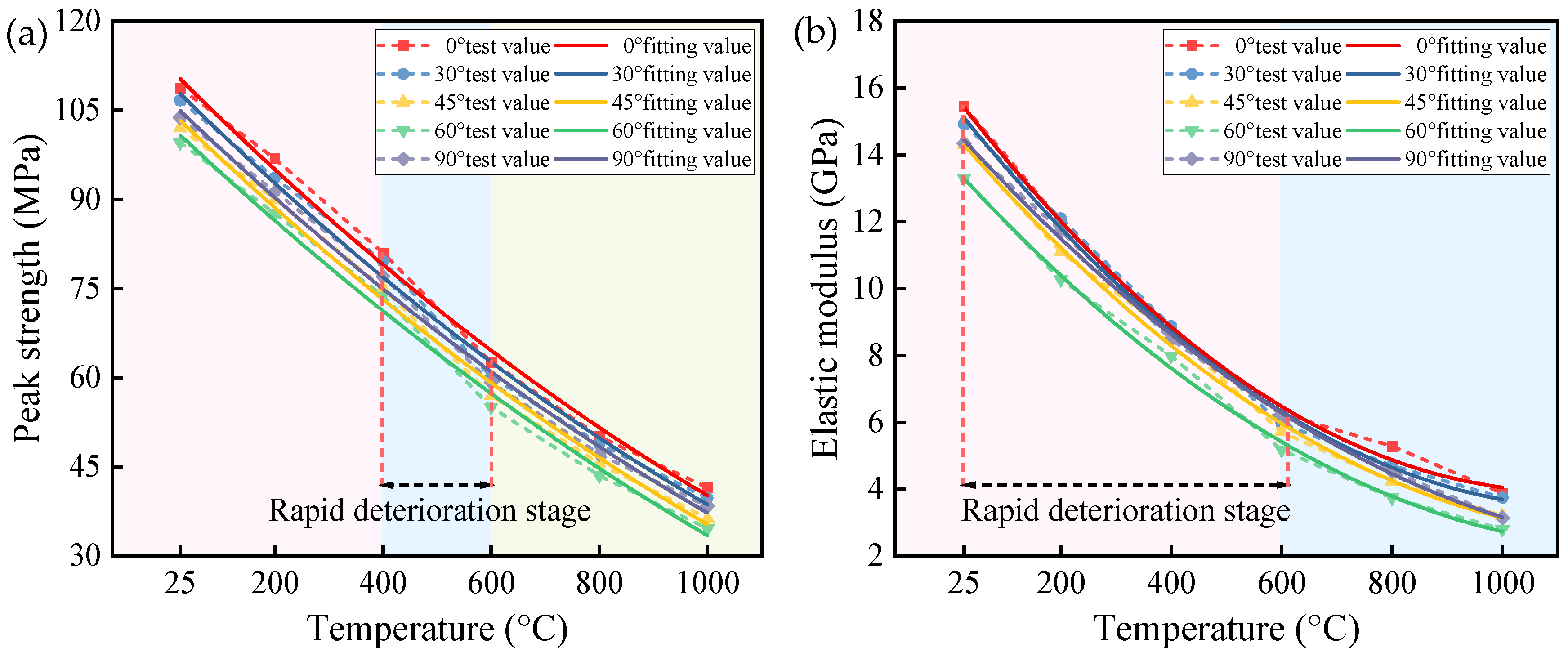 - Specimens exposed to uncoupled acid solutions at lower temperatures (25–600 °C) exhibited high brittleness, and some specimens disintegrated under uniaxial compression. Shear-dominated failures along prefabricated fractures prevailed with increasing angles. Acid corrosion suppressed brittle disintegration by forming non-uniform notches that enabled gradual energy release, promoting shear slip along fractures. Acidic environments significantly increased Ts crack density and shifted failure modes from shear-dominant to tensile-shear hybrid patterns.