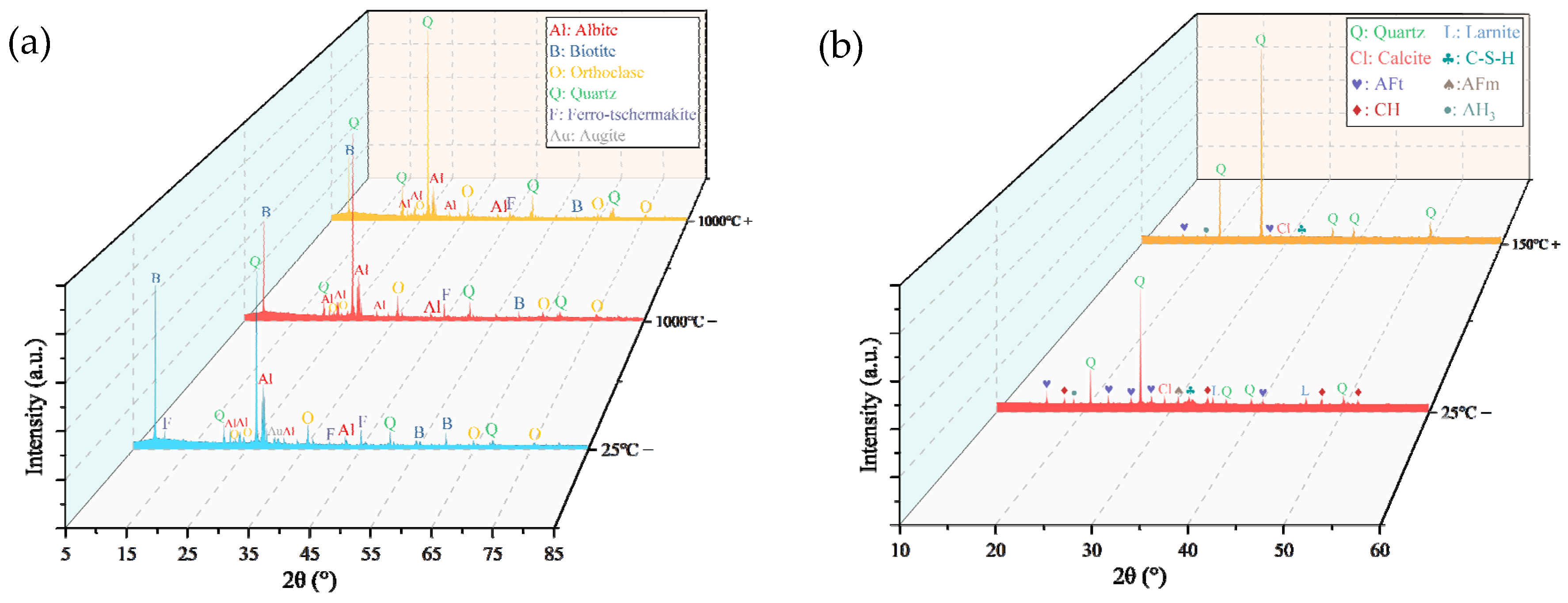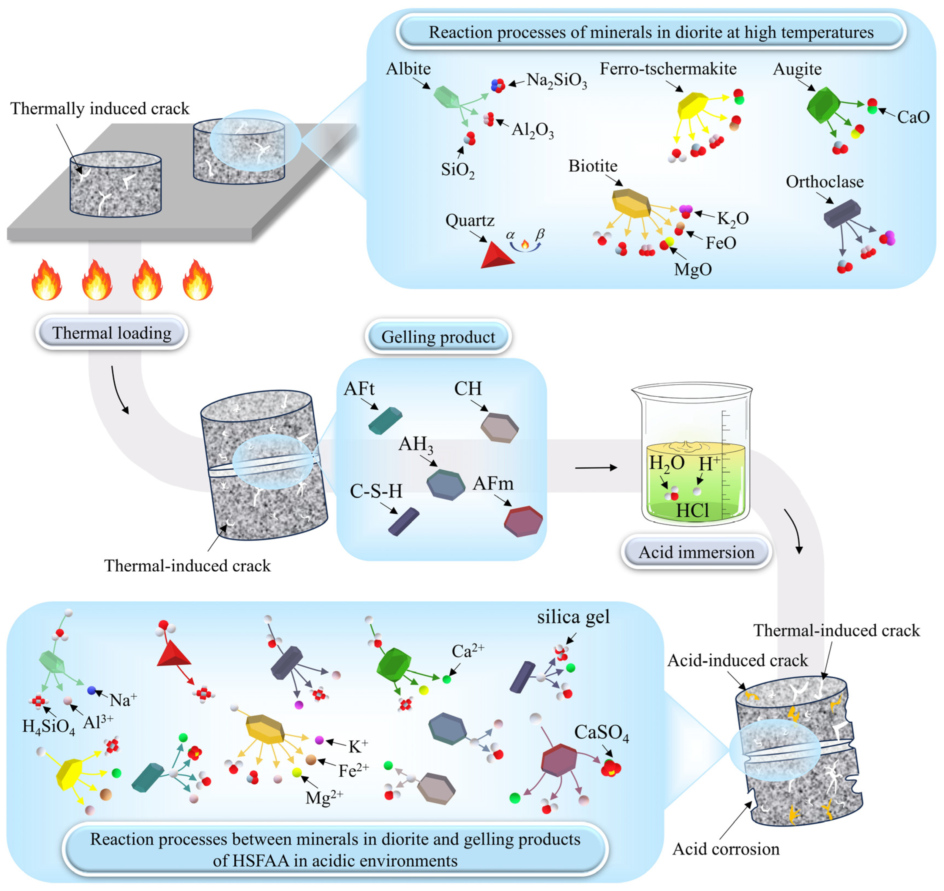 - When thermal treatment exceeded 600 °C, phase reconstruction and oxidation reactions of minerals like biotite transformed surfaces from gray-black to brown. Acid immersion led to whitening and severe corrosion at HSFAA edges. The “thermal–acid” coupling accelerated mineral dissolution and structural transformation, resulting in a whitening appearance dominated by insoluble mineral residues.