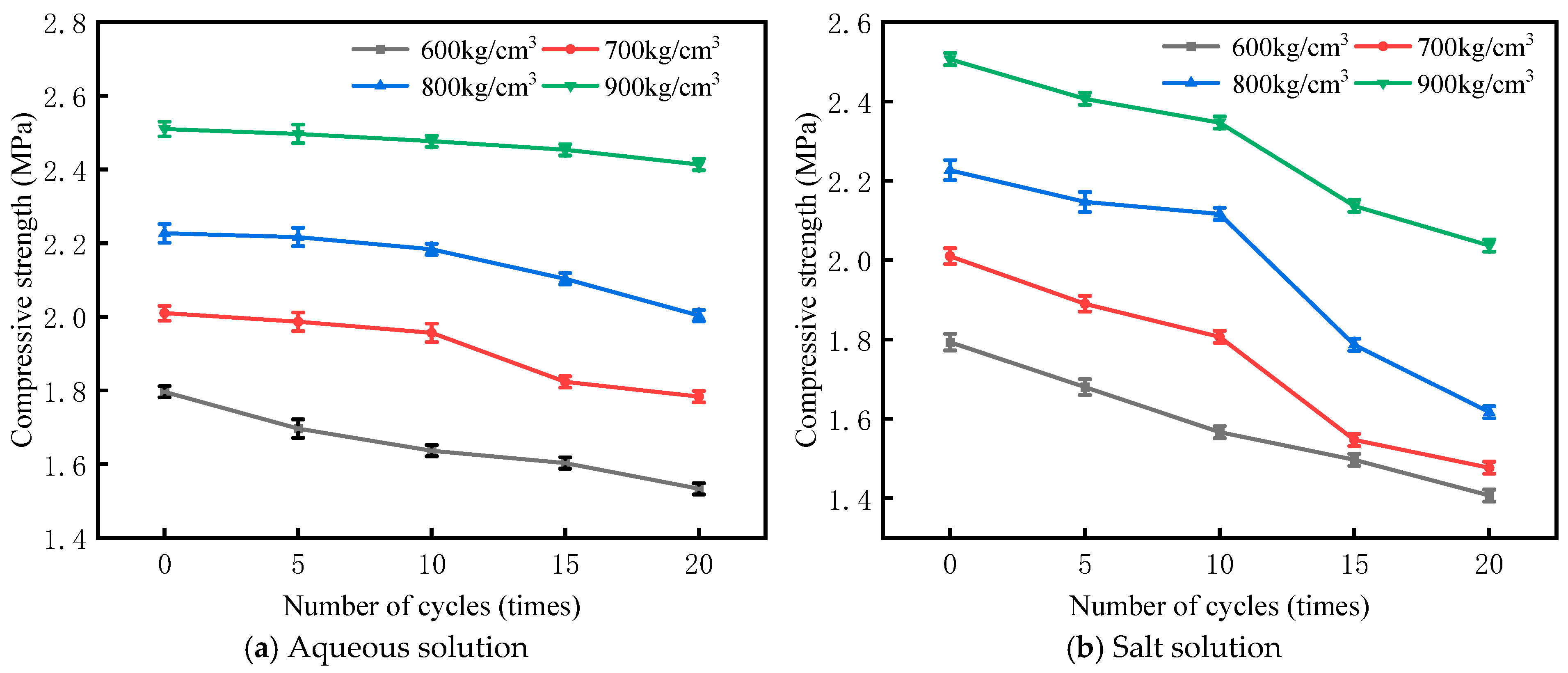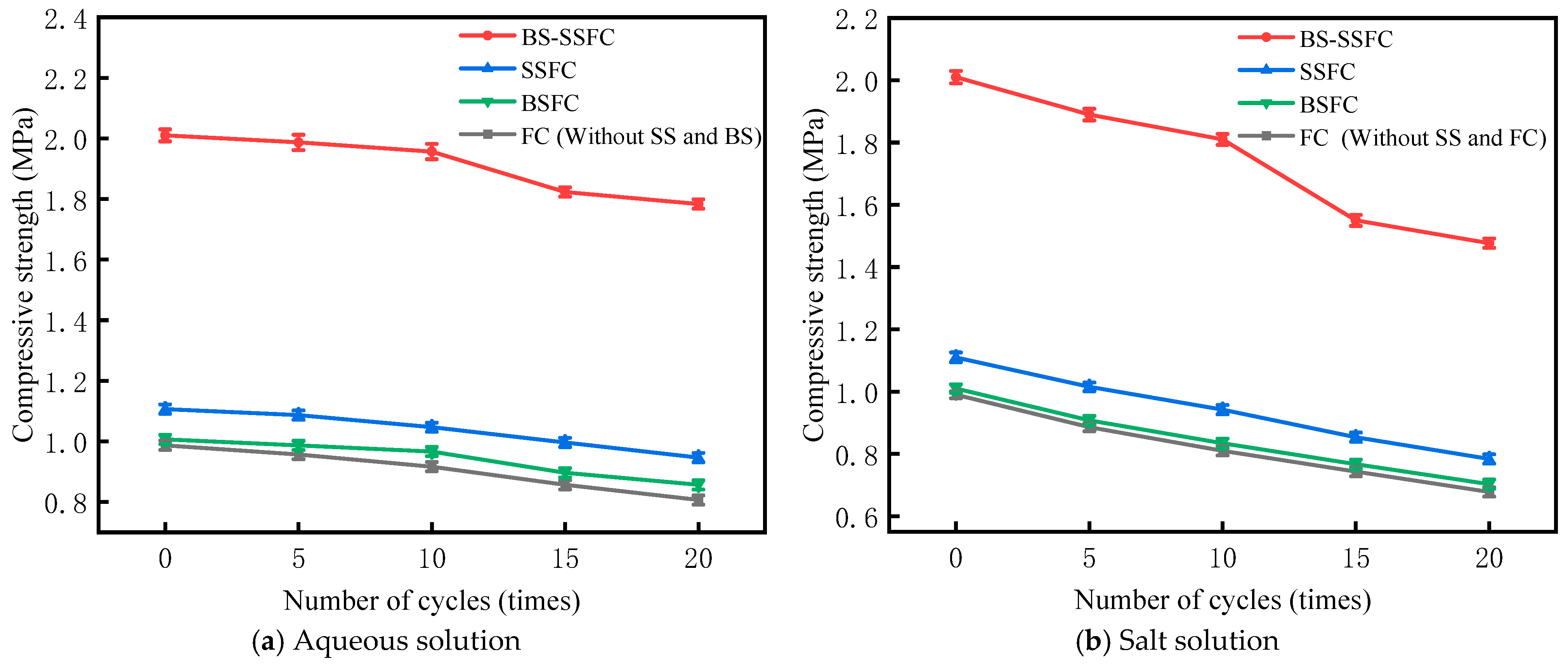 - Under wet–dry cycling conditions, the strength of BS-SSFC with different dry densities gradually decreases as the number of cycles increases; the higher the dry density, the greater the strength retention rate. After wet–dry cycles in different solutions, the order of the CS loss from largest to smallest is as follows: salt solution > aqueous solution.