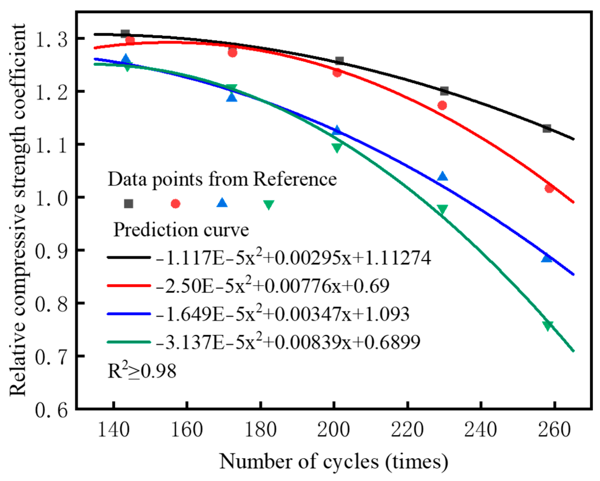 - The fractal dimension of BS-SSFC in different solutions decreases slightly with the increase in the number of wet–dry cycles. By calculating the fractal dimensions under different cycle times using the box-counting method and based on fractal theory, it is found that, in water and salt solutions, the relationship between the compressive strength and porosity of BS-SSFC under different wet–dry cycle times conforms to a specific regularity; meanwhile, the compressive strength at zero porosity has a specific correlation with the number of cycles (n). This regularity is also verified by the experimental data of other researchers.