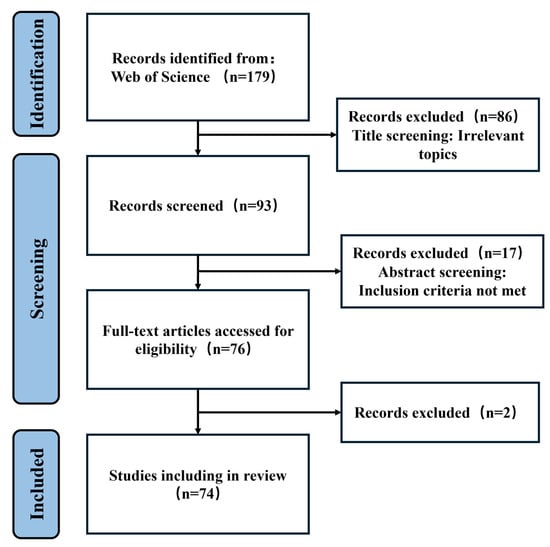 This systematic review was conducted following the Preferred Reporting Items for Systematic Reviews and Meta-Analyses (PRISMA, Detailed information can be found in the Appendix A) 2020 guidelines. The review protocol was not registered. The analysis examined machine learning applications in land use prediction through a comprehensive examination of 74 research publications spanning 2020–2024. The final results were independently obtained by the three authors (Figure 1). Literature search was conducted using the Web of Science Core Collection database with the following search strategy: