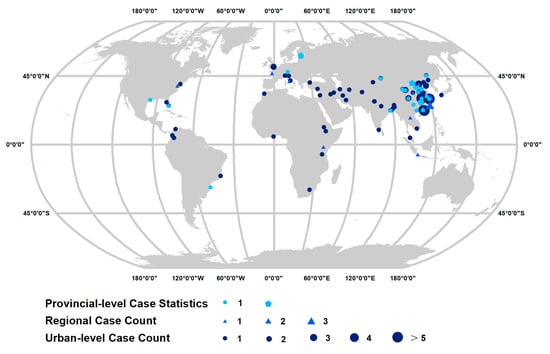 Distribution map of land use prediction application cases. Different shapes and colors represent different levels of case selection: the pentagon represents the core area point of the regional research case point; the triangle represents the central area point of the case study for state-level provincial regions; the circle represents the central coordinates of the urban-level case points; the size of the pattern represents the number of selected research articles.