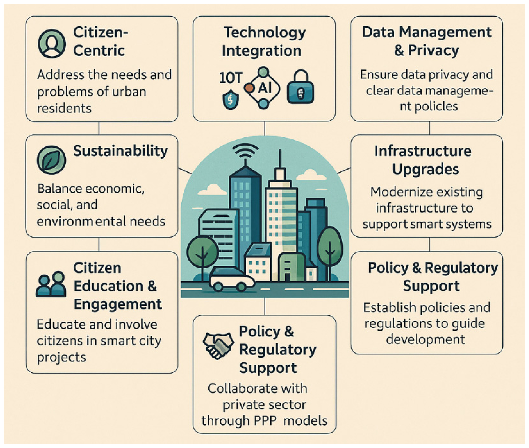 - Citizen-Centered Design: Smart city design should begin with addressing citizens’ real needs—improving convenience, safety, and sustainability [18].