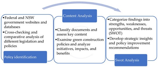 The policy review method, as a systematic process, is utilized in this study. The method benefits policymakers in decision-making and in allocating resources strategically [], and for evaluating existing policies, identifying gaps, and proposing improvements []. The method has been applied to assess comprehensive school safety in Vietnam [] and to develop the strategies of the ethical use and development of artificial intelligence (AI) []. In this study, the policy review method, rooted in the NSW context, mainly includes three research steps of policy identification, content analysis, and SWOT analysis, as indicated in Figure 1.