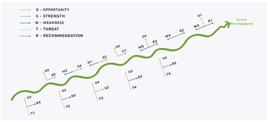 Based on the preceding SWOT analysis, coordinated and proactive policy responses are essential to advance green development in the NSW building industry. Targeted interventions should establish long-term policies that address the identified threats and weaknesses. More importantly, robust implementation strategies are required within the industry to close the green development gaps that cannot be resolved solely through the identified strengths and opportunities. Figure 2 illustrates the interrelationships among the SWOT factors and outlines the recommended implementation strategies.