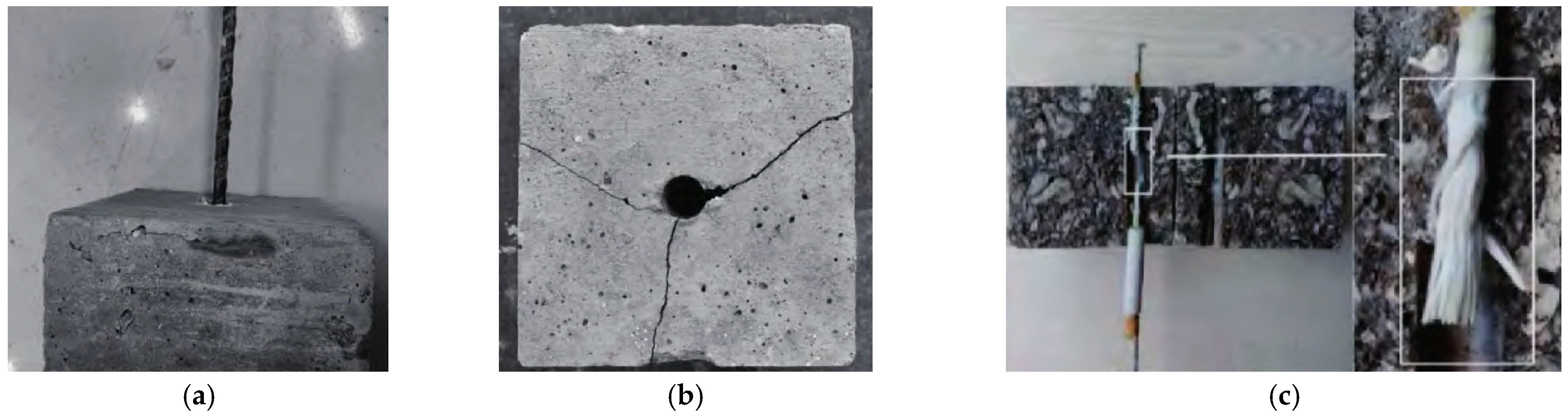 - Gao, J.; Fan, L.Y. Experiment on bond performance between CFRP bar and seawater sea sand concrete and its working mechanism. Acta Mater. Compos. Sin. 2022, 39, 1194–1204. (In Chinese) [Google Scholar]