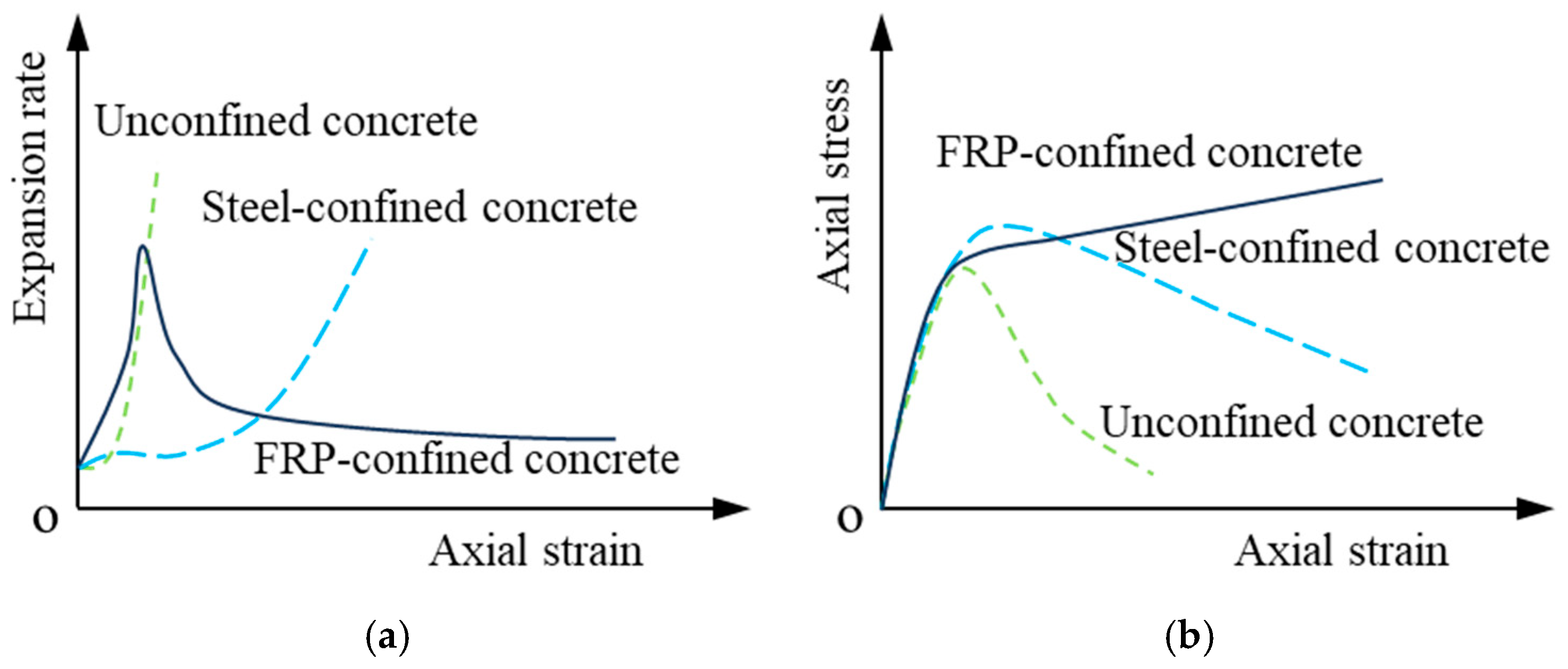 - Dai, J.G.; Bai, Y.L.; Teng, J.G. Behavior and modeling of concrete confined with FRP composites of large deformability. J. Compos. Constr. 2011, 15, 963–973. [Google Scholar] [CrossRef]
