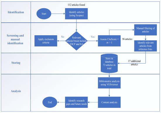 To achieve the aim of this review paper, extensive analysis and categorisation of existing literature in the field of 3DCP and recycled materials were carried out. For this purpose, tools such as bibliometric analysis were utilised [,]. A bibliometric analysis is a statistical method which analyses extensive scientific databases based on various research factors. One of the main advantages of utilising such technique is the wider availability of scientific databases such as Google Scholar and Scopus. Furthermore, bibliometric software such as VOS viewer 1.6.20 and cite score provide ease of accessibility for users to analyse the available databases []. Additionally, bibliometric analysis offers objective, quantitative measures of research activity, impact, and trends over time. Furthermore, bibliometric methods, such as co-citation analysis and network analysis, help in visualising the structure of knowledge within a field, revealing sub-disciplines and emerging research fronts []. However, citation counts and other bibliometric indicators may not capture the societal and practical contributions of research, thus favouring more conventional and mainstream topics over innovative or interdisciplinary research that might be equally valuable []. To capture the full picture, Matarneh et al. (2019) [] suggests incorporating content analysis. This analysis method offers researchers a wider view to explore the quantitative and qualitative inquiries in an array of journal articles. Furthermore, content analysis facilitates the identification of patterns, themes, and biases within data, allowing researchers to draw inferences regarding the messages, audience, and cultural contexts [].