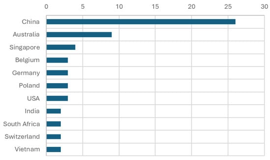 Furthermore, bibliometric analysis estimates that the articles published were predominantly from China, which contributed up to 45% of the total number of publications per country. The second highest number of publications based on country came from Australia, which contributed approximately 16% of the total number of publications. This is then followed by Singapore, which contributed up to 7% of the total number of publications. This analysis also indicated a moderate level of contribution from European countries such as Belgium, Germany, and Poland, each with three publications. Most notably, the United States had a relatively lower number of publications within this domain. Furthermore, only one publication originated from the UK. This distribution could reflect the varying stages of development and investment in sustainable technologies. Figure 3 shows the distribution of published articles based on country/territory.