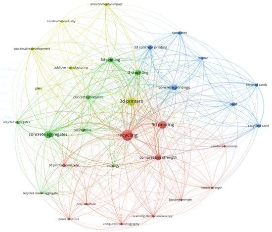 Network analysis of the relevant keywords conducted using VOSviewer shows four main clusters based on the frequency of the keywords, which was selected to be four or more, as shown in Figure 4. The first keywords cluster contained keywords relating to 3D concrete printing and durability. These keywords included 3D-printed concrete, bending strength, compressive strength, computerised tomography, pore structure, and reinforced concrete. The second keywords cluster contained 3D concrete printing and recycled aggregates rheology. This cluster contained the following keywords: 3D printing, concrete aggregates, concrete mixture, recycled aggregates, recycled coarse aggregates, rheology, and yield stress. The third keyword cluster relates to 3D concrete printing recycled mortars, and contained keywords such as 3D concrete printing, mortar, and recycled sand. The final keyword cluster related to the lifecycle assessment of 3D concrete printing and included the following keywords: 3D printers, additive manufacturing, construction industry, environmental impact, glass, and sustainable development. Sandra et al. [] stated that while the keyword analysis helps to cluster trends in the literature, it is insufficient for new research areas due to the frequency of the keywords. As such, content analysis is required to establish the research patterns and trends more accurately [,].