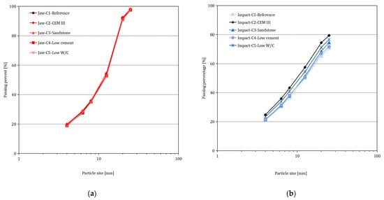 Sieving analysis results of different types of concrete waste used as aggregates: (a) jaw crusher results; (b) impact crusher results—reprinted from Hubert et al. (2023) [] under Creative Commons Attribution 4.0.
