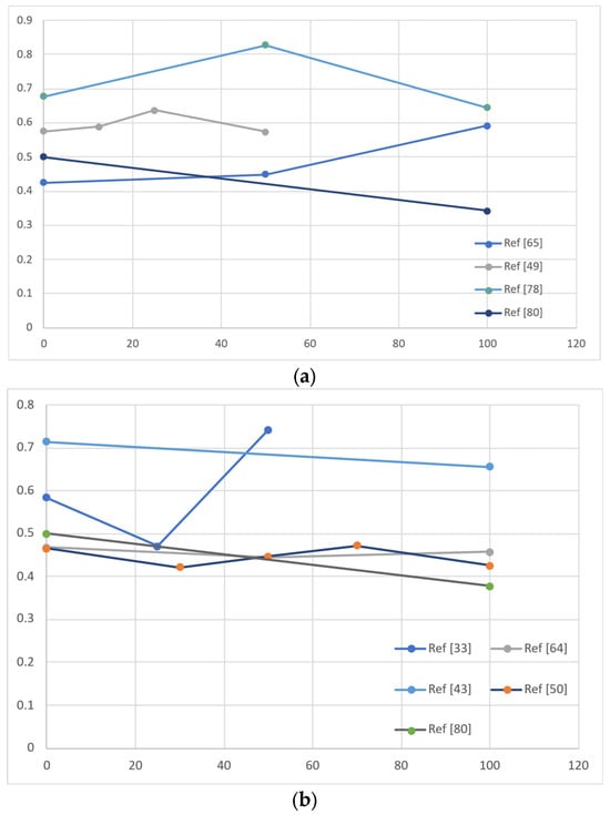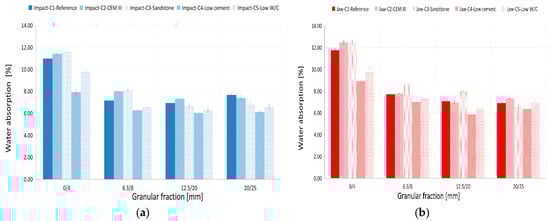Water absorption rate for samples made with different compositions of RFA: (a) aggregates obtained from impact crusher; (b) aggregates obtained from jaw crusher. Reprinted from Hubert et al. (2023) [] under Creative Commons Attribution 4.0.