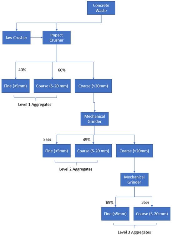 Gokce et al. (2011) [] introduced a framework that maximises the extraction of fine aggregates while reducing the amount of mortar adhered to the old concrete. In this process, a mixture of jaw crusher, impact crusher, and mechanical grinders were utilised to achieve this at various levels. The first level uses a jaw crusher and an impact crusher, which produce 40% fine aggregates (classified under 5 mm) and 60% coarse aggregates (between 5 and 20 mm). The second level utilises a mechanical crusher and takes the resulting coarse aggregates from the previous step to produce an additional 55% fine aggregates and 45% coarse aggregates. The final level takes the coarse aggregates generated from the previous step and runs it through the mechanical grinder one more time to produce a further 65% fine aggregate and 35% coarse aggregate. The resulting aggregate properties were compared between the first-level and third-level coarse aggregates. The study indicated lower water absorption rates and specific densities for level 3 aggregates compared to those from level 1. The absorption rates of level 1 aggregates ranged between 4.88 and 6.27%, whereas the absorption rates of level 3 aggregates ranged from 3.14 to 5.07%. The specific densities of aggregates from level 1 ranged from 2.37 to 2.42 g/cm3. This was attributed to the reduction in mortar content by an average of 51%, from a range of 52.3–55.7% to a range of 30.2–45.5%. The findings of this study are consistent with the findings of previous works in terms of the effect of adhered mortar on the water absorption rate, density, and porosity [,,]. However, this study did not assess the relationship between the behaviour of the resulting aggregates, their shapes, and properties such as the water absorption rate. Figure 7 illustrates the waste recycling processes adopted by Gokce et al. (2011) [].