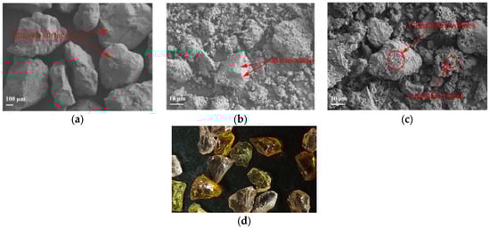 Jiang et al. (2022) [] assessed the morphology of recycled fine aggregates made from cement paste and mortar using scanning electron microscopy (SEM). Recycled aggregates made with paste and mortar displayed rough surfaces as well as shape irregularities compared to natural aggregates. Moreover, pores and microcracking were more visible with recycled aggregates. Lastly, the recycled aggregates displayed increased clusters of hydrates, as shown in Figure 8a–c. These findings are consistent with other authors [,]. Liu et al. (2023) [] reported the formation of calcium hydroxide (CH) inside of the pore structures. Furthermore, Liu et al. (2023) [] concluded that adjusting the mixture’s superplasticisers would not affect the pore structures and would instead have a minimal effect.