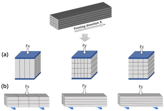 Printing direction and (a) compressive test loading based on printing direction (b) flexural test load applications based on printing direction—reprinted from Liu et al. (2022) [] under licence number 5993650995985.