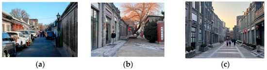 Case Studies of Historic District Renewal. Figure Source: Taken by the author. (a) Current Status of Ju’er Hutong. (b) RenovationAuxiliary Street of Qianmen Street. (c) Qianmen Street Main Street.