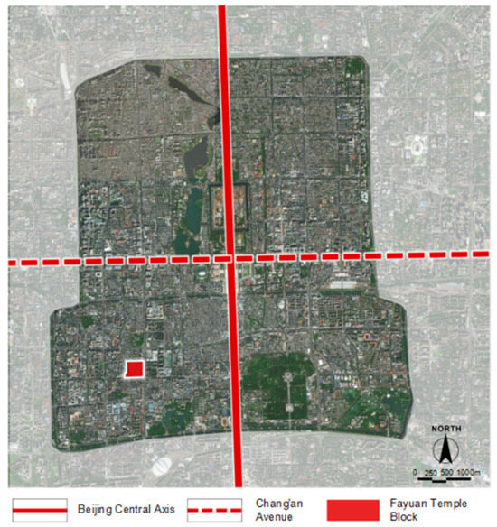 This study takes the pedestrian spaces in Beijing Fayuan Temple Historic and Cultural District as the core research object, focusing on the interaction between material and non-material elements, and explores their composite value in the inheritance of urban context and the improvement of spatial quality. The Fayuan Temple Historic and Cultural District is located in the southwest of Beijing’s old city, covering an area of approximately 32 hectares. This area completely preserves the street texture of the Liao Dynasty (Figure 2), with existing historical buildings accounting for 41%, among which 12 are national-level cultural relics protection units. According to the “Regulatory Detailed Plan for the Core Area of the Capital’s Functions” (2018) [7], its functional positioning is “a core node of cultural exploration routes”.