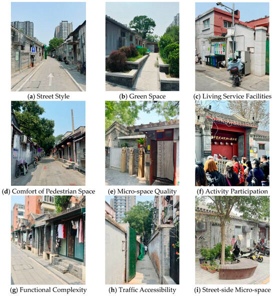 Based on preliminary research and investigations of historical and cultural districts, courtyard dwellings (siheyuan), and hutong alleys, this study has refined a list of perceptual factors for pedestrian spaces (Table 2). Among these, physical elements refer to the objectively existing, directly perceivable tangible entities within the pedestrian environment, which serve as the physical carriers of the walking experience; non-physical elements, although not existing in tangible form, profoundly influence people’s perception, utilization, and emotional connection to the space.