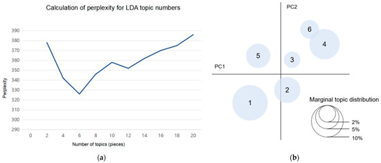 Machine learning has significant advantages in topic recognition and semantic mining, and can handle large amounts of data. Therefore, the Latent Dirichlet Allocation (LDA) model [25] is introduced. LDA is an unsupervised generative statistical model used to discover latent topics in a corpus. Each document is represented as a mixture of multiple topics, with each topic being a probability distribution over words. This method can be applied to classify themes in tourist reviews in the internet-dominated era, thereby capturing the predominant sentiments among visitors. The figures show that when the number of topics is 6, the perplexity is the smallest, and this classification has the strongest generality. The distribution of each dimension in the topic distance map is relatively scattered, and the semantics of keywords are relatively consistent, which can clearly reflect the characteristics of various topics (Figure 5).