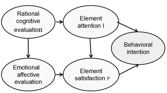 The IPA (Importance–Performance Analysis) two-dimensional evaluation model [27], a classic tool in tourism geography research, has a technical core focused on deconstructing the cognitive mechanisms of tourist destinations. Drawing on the tourists’ “cognition-emotion-intention” psychological model (Figure 6). The direction of arrows in the diagram typically represents the paths of influence within the model. An arrow pointing from “Rational Cognitive Evaluation” to “Emotional Affective Evaluation” indicates that rational, logical analysis directly influences and shapes emotional responses. An arrow from “Rational Cognitive Evaluation” to “Element Attention I” signifies that during decision-making, rational cognition acts as a filter, evaluating the value of various attributes and thereby determining which aspects individuals should prioritize. An arrow from “Emotional Affective Evaluation” to “Element Satisfaction P” denotes that an individual’s emotional state influences their satisfaction judgment regarding the performance of specific elements. Finally, arrows from both “Element Attention I” and “Element Satisfaction P” pointing to “Behavioral Intention” demonstrate that behavioral intention is jointly determined by “what individuals consider important” and “their satisfaction with the performance of these important aspects”. The study uses the frequency of elements in review data as tourists’ attention and the element satisfaction derived from Likert scale scoring as tourists’ satisfaction. To further explore suggestions for optimizing the perceived elements of pedestrian spaces in the district, IPA (Importance–Performance Analysis) is introduced to evaluate and prioritize elements in the renovation of historic districts.
