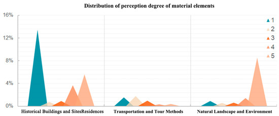 In the dimension of intangible element perception, it includes the content of concern and degree of attention in three aspects: culture and historical figures, social life and activities, as well as tourism and tourist experience (Figure 8 and Table 4).