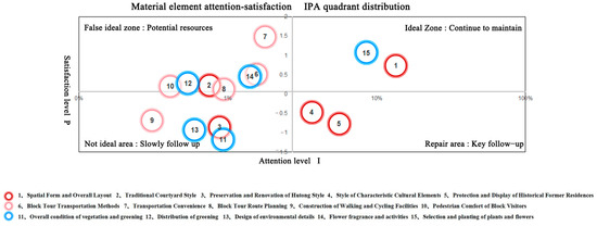 In the IPA matrix, the horizontal axis represents “performance” scores and the vertical axis represents “importance” scores. This study constructs a coordinate matrix with attention as the horizontal axis and satisfaction as the vertical axis, and derives the current status of tourists’ perceptions of various elements in the pedestrian spaces of historic districts based on the distribution of these elements [28].