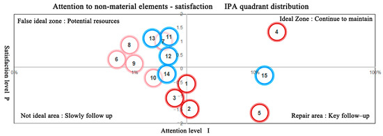 Using the Importance–Performance Analysis (IPA) framework, an IPA model was constructed with the Importance (I) values of each indicator plotted along the horizontal axis and the Performance (P) values (Satisfaction) plotted along the vertical axis. The truncated mean values for Importance (2.72%) and Satisfaction (P) (0.0615) served as the reference points for the horizontal and vertical axes, respectively. The distribution of perceived elements across the resulting quadrants is detailed in Table 5 and Table 6. Figure 9 and Figure 10 illustrate the IPA quadrant distributions depicting the Importance–Satisfaction relationship for non-material elements and material elements, respectively.