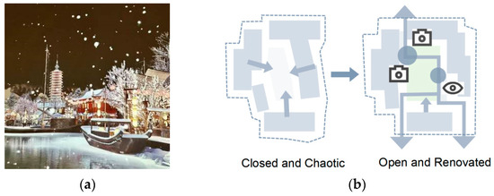 Historical pedestrian streets suffer from excessive commercialization that erodes their cultural essence. For example, the organic renewal of Ju’er Hutong (Figure 1c) stands in contrast to the “fake antique” phenomenon in some other blocks. In the context of the protection and renewal of historical blocks, the “fake antique” phenomenon specifically refers to a short-sighted practice that disregards historical authenticity and cultural continuity. It focuses on pursuing short-term commercial interests or superficial visual effects, while blindly constructing imitation ancient buildings or man-made historical landscapes.