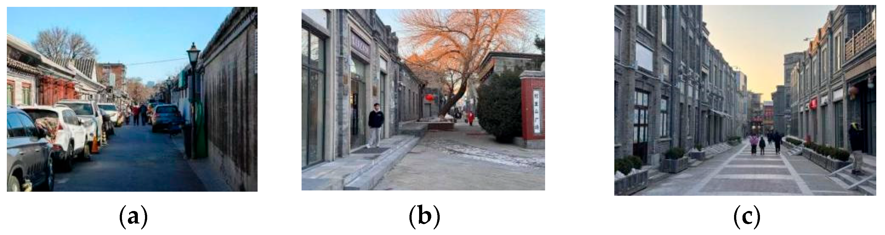 - Xie, Q.; Hu, L.; Wu, J.; Shan, Q.; Li, W.; Shen, K. Investigating the Influencing Factors of the Perception Experience of Historical Commercial Streets: A Case Study of Guangzhou’s Beijing Road Pedestrian Street. Buildings 2024, 14, 138. [Google Scholar] [CrossRef]