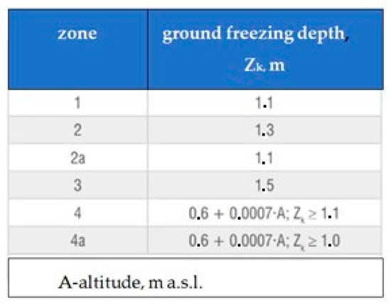 - Żurański, J.A.; Godlewski, T. O Przemarzaniu Gruntu w Polsce; Building Reasearch Institute: Wrocław, Poland, 2017. [Google Scholar]