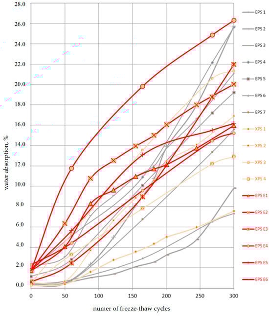 - The results indicate a significant increase in the λ coefficient after freeze–thaw cycles in relation to the initial value, especially at higher water absorption values. These changes confirm even twofold increases in the above-mentioned initial values and range from 0.0213 to 0.0415 W/(m·K);