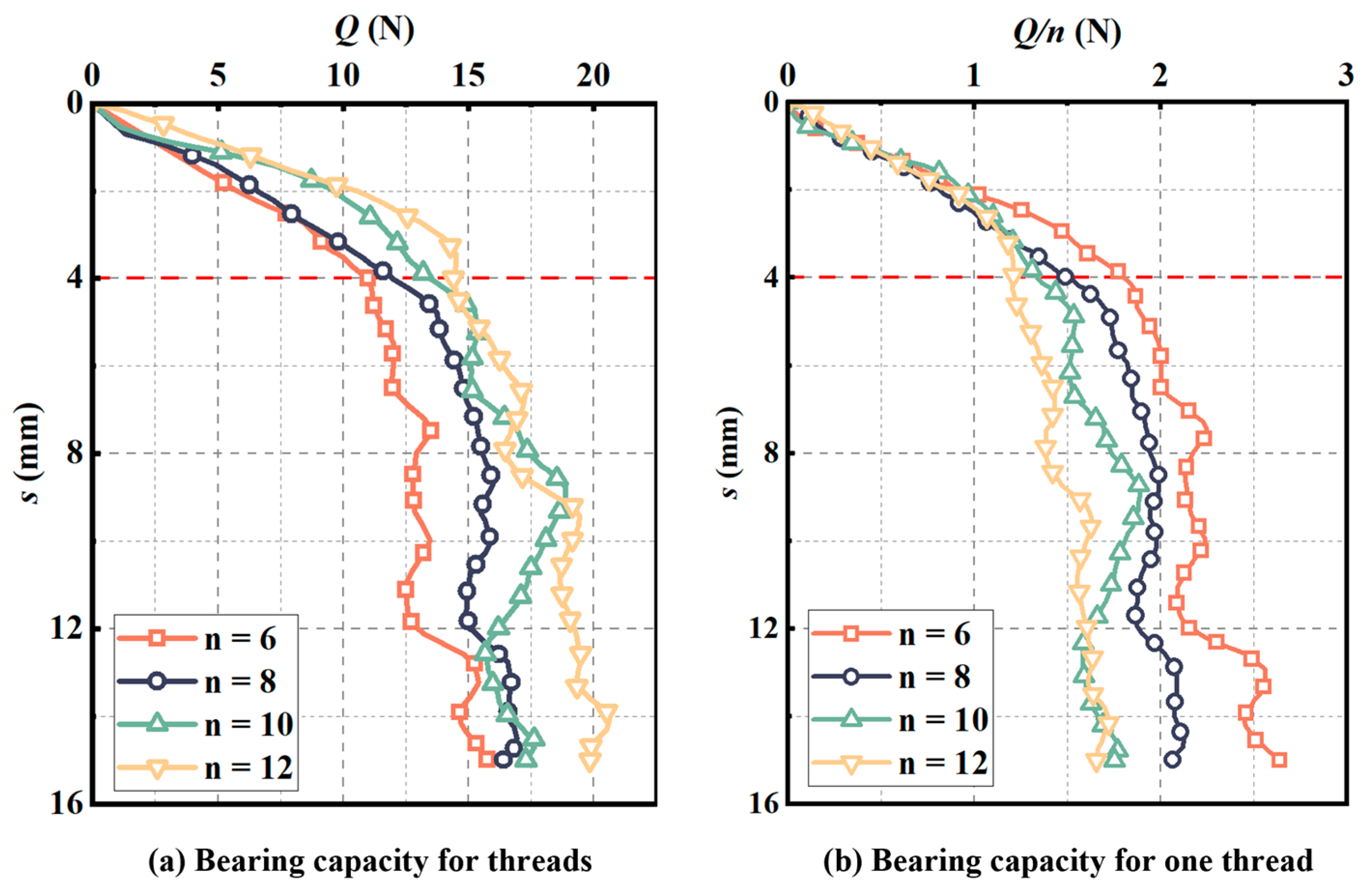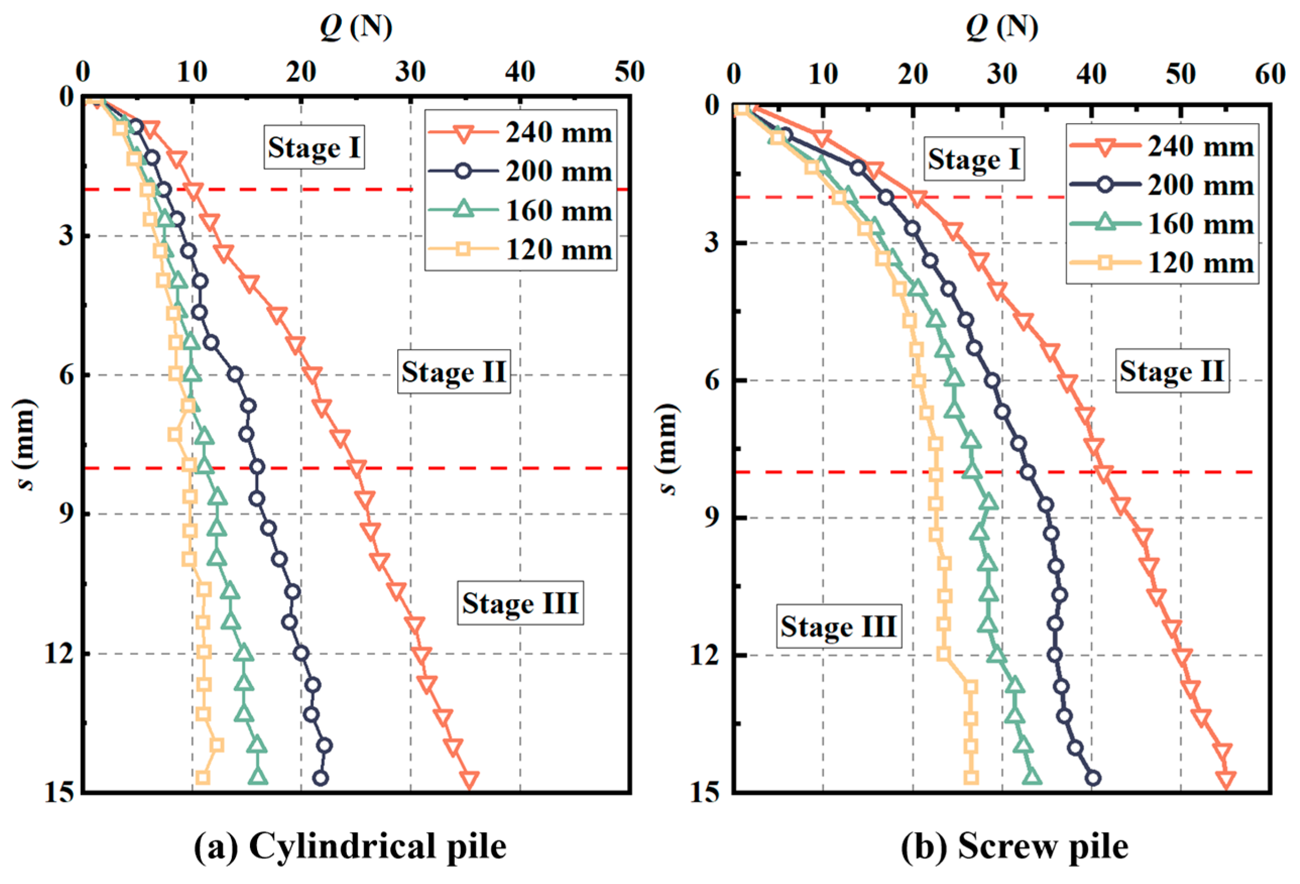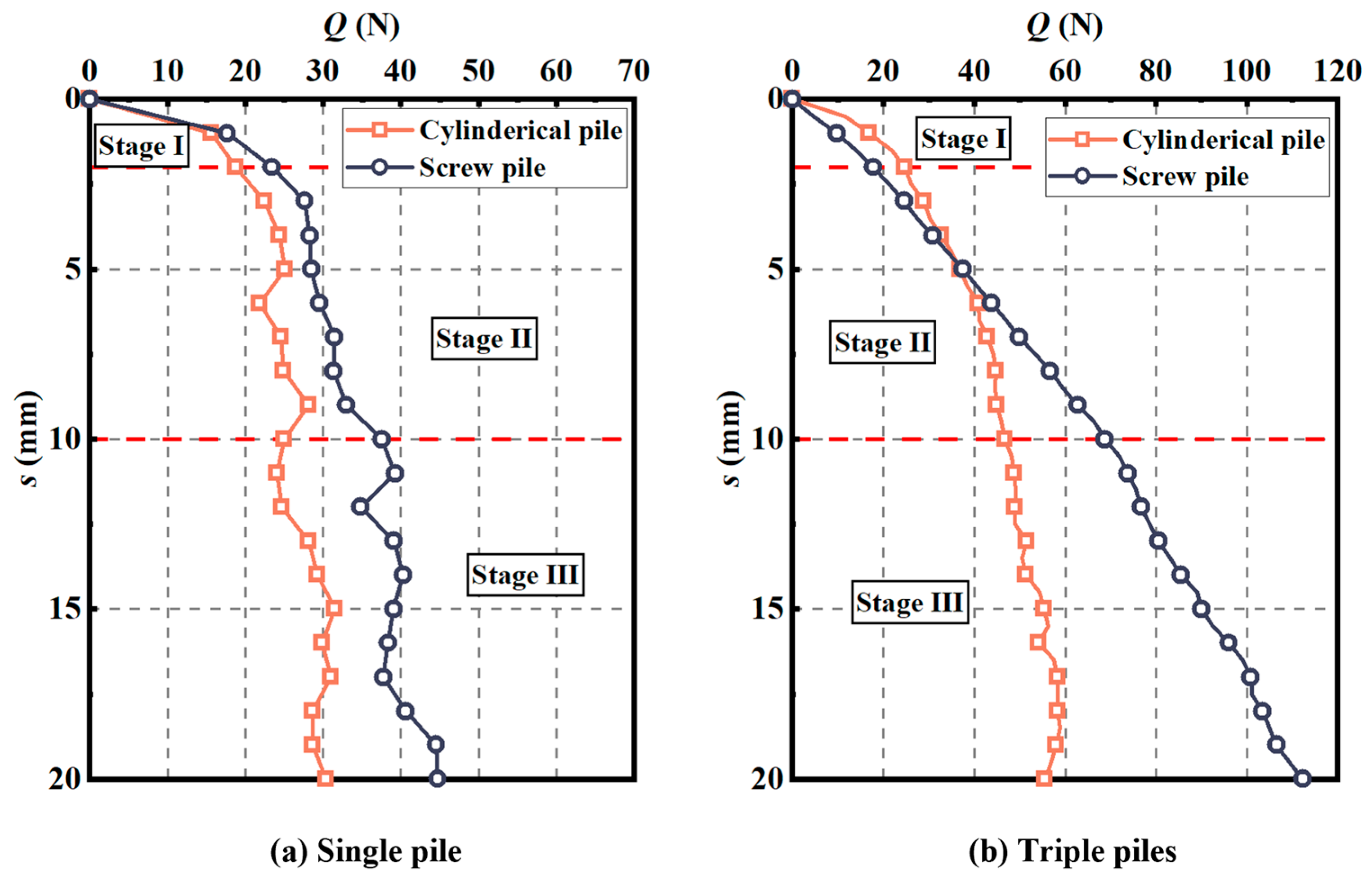 - The unique load-transfer mechanism of screw piles was attributed to its threads, which was the fundamental reason for its higher pile resistance than unthreaded piles. The ultimate bearing capacity of a single screw pile was approximately 50% higher than that of a cylindrical pile with the same outer diameter and length (33 N compared to 22 N at an embedment length of 200 mm). For pile groups, the group effect coefficient of a triple-pile group composed of screw piles was 0.64, while that of cylindrical piles was 0.55.