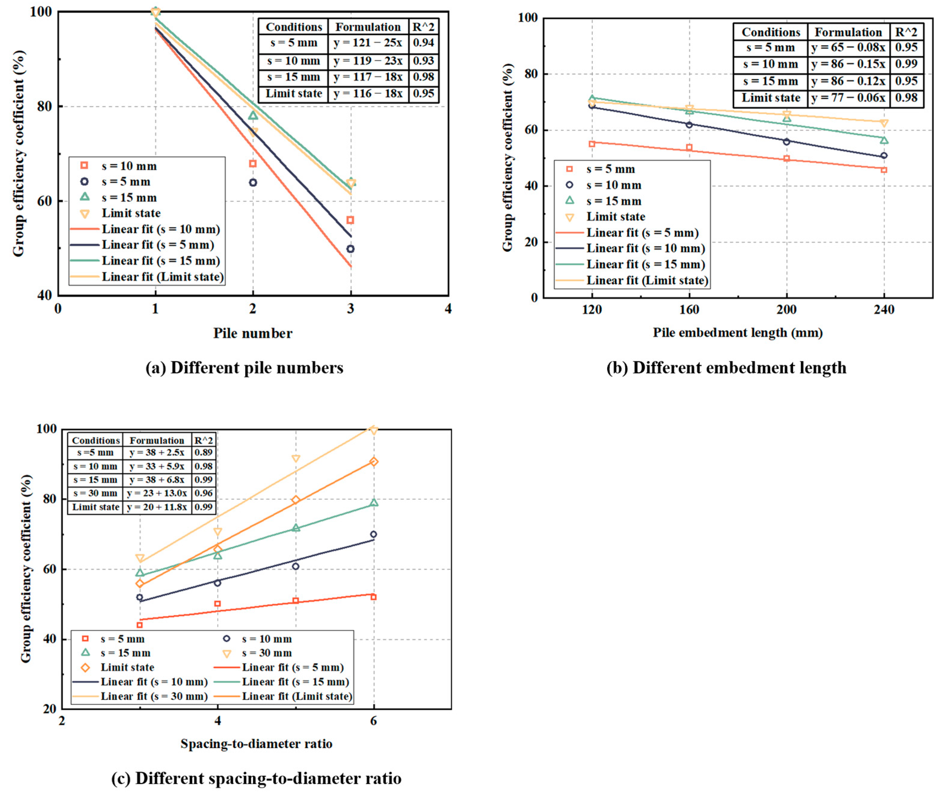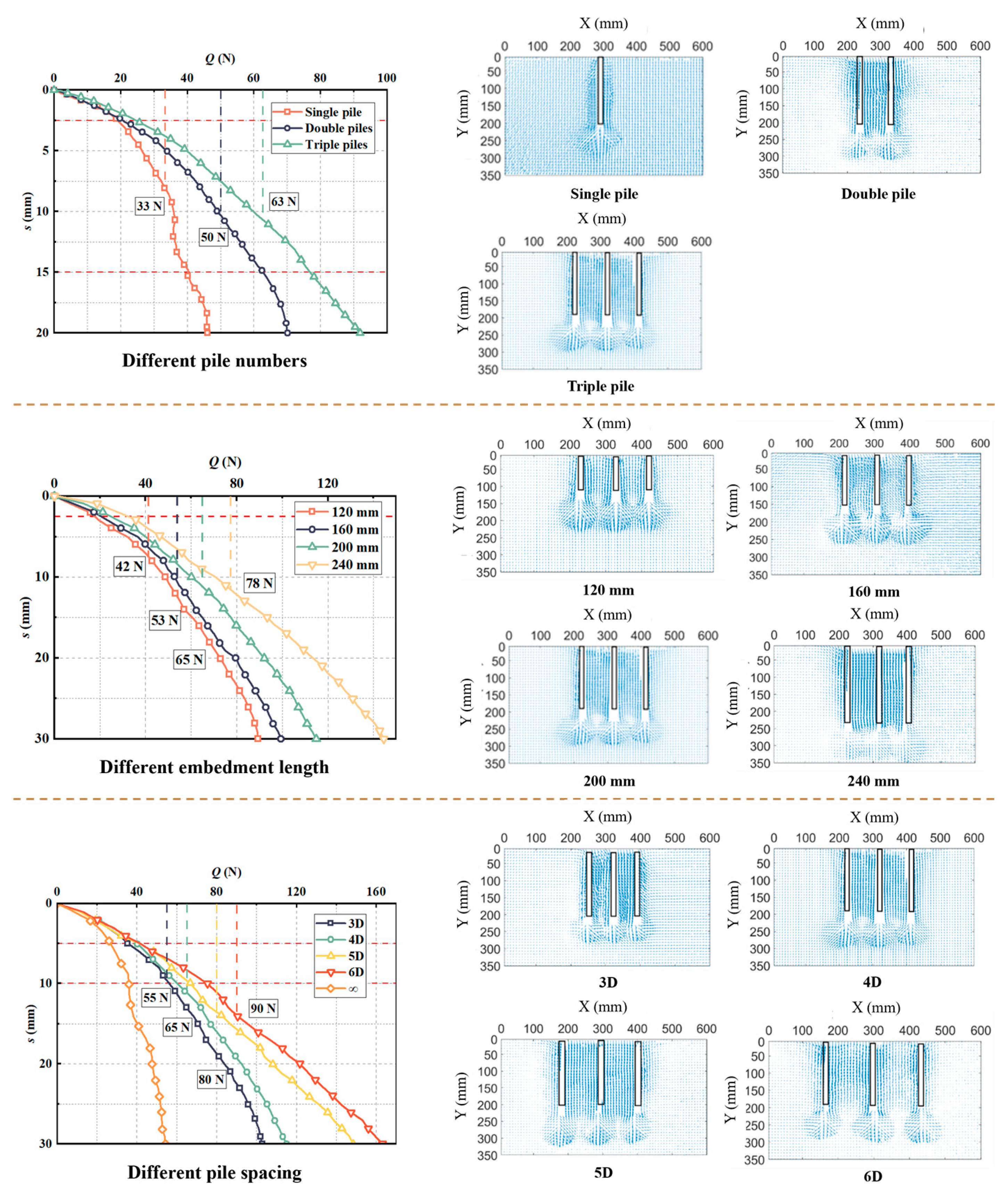 - The pile resistance of the pile group was related to the embedment length and the pile spacing. Increasing the embedment length from 120 mm to 240 mm resulted in an 85% increase in the ultimate bearing capacity of the triple-pile group. Increasing the pile spacing from 3D to 6D increased the ultimate bearing capacity by 64%, and the group effect coefficient increased from 0.56 to 0.91. According to the DEM model, the pile resistance was influenced by the interaction of soil particles between screw piles.
