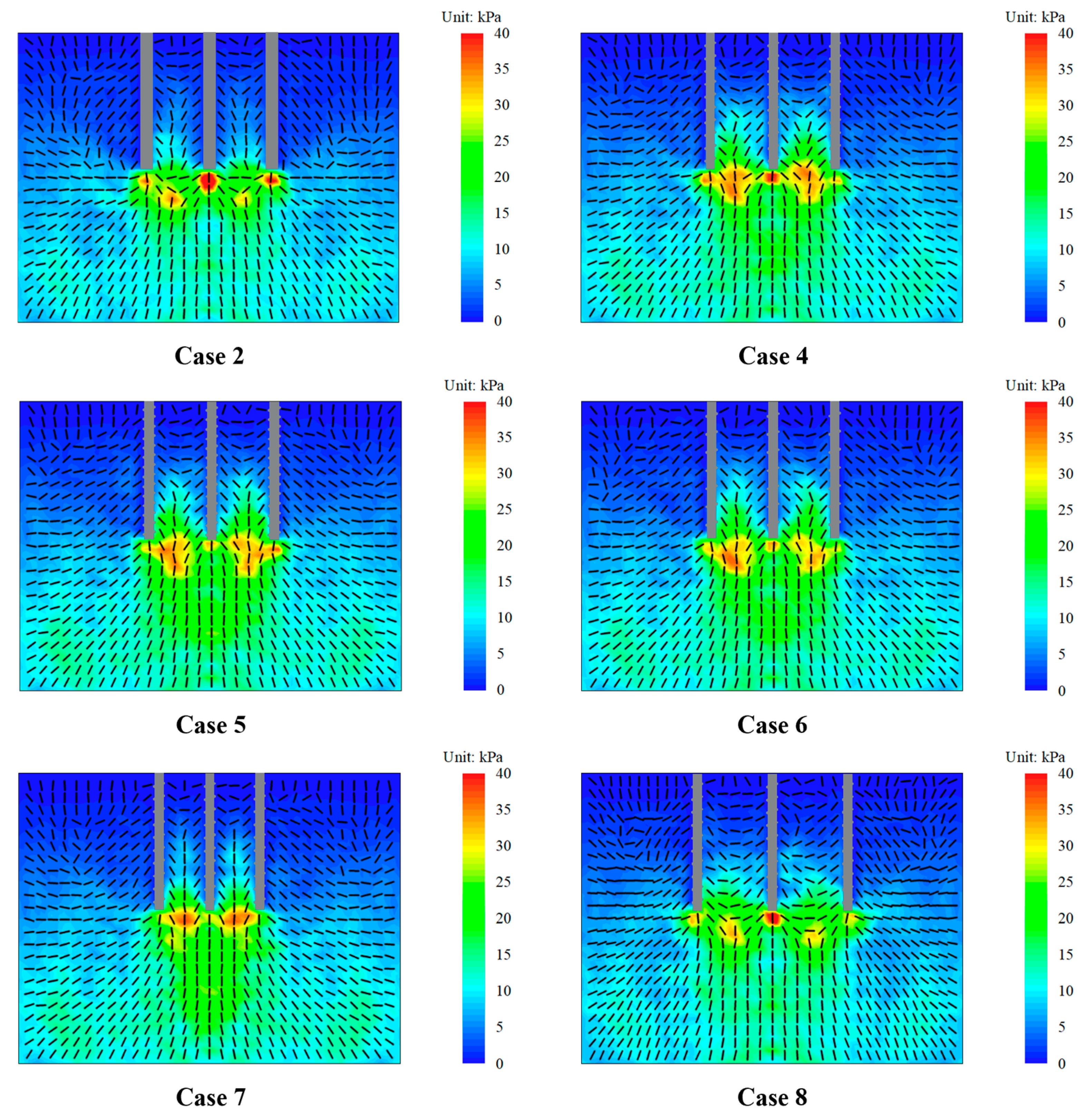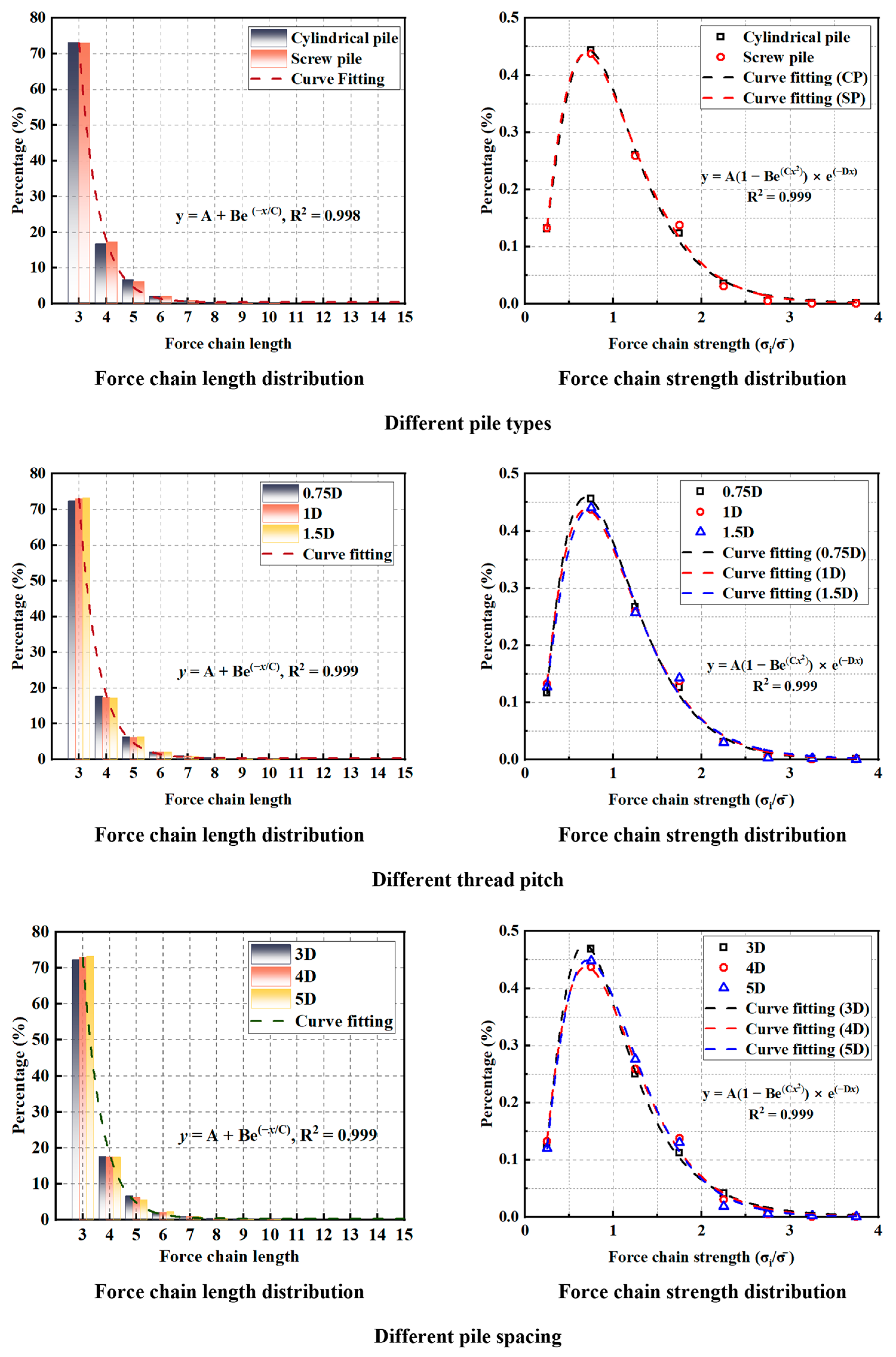 - Increasing the pitch from 0.75D to 1.5D resulted in an approximately 28% increase in the area of high-stress regions (>20 kPa), reducing stress concentration. By comparing the pile resistance of each pile within a screw pile group with the contact anisotropy of soil, it can be seen that there was a positive correlation between the pile resistance and the contact anisotropy strength , and a negative correlation between the pile resistance and the contact normal direction .