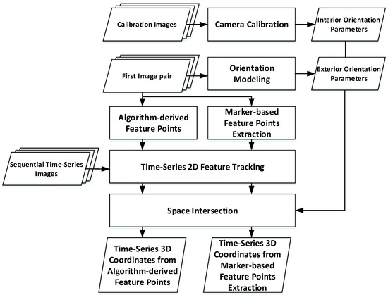 The main procedures for obtaining the time-series 3D coordinates of wall surface points were as follows: (1) camera calibration to determine the interior orientation parameters (IOPs); (2) orientation modeling to obtain the EOPs; (3) extraction of wall surface feature points from the initial image set; (4) sequential image matching to track the 2D image coordinates of feature points; and (5) space intersection to compute the time-series 3D coordinates of the wall surface points.