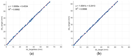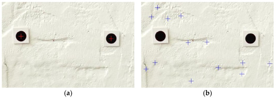 Figure 2 compares the different types of feature points. The target points (red cross in Figure 2a) were manually placed on the wall surface, providing well-defined, high-contrast centroids for feature extraction. This target approach enables precise reference points but requires significant manual effort for installation. It may also obscure surface textures that are essential for damage assessment. In this study, artificial markers were generally arranged using a scale with a spacing of 15 cm. However, due to the need to also install control targets and the unevenness of the brick wall surface, some points had a spacing of 20 cm. As a result, although artificial markers provide relatively high accuracy, it is practically impossible to ensure perfectly uniform distribution on the surface, and such situations are often unavoidable in practice. This limitation was one of the motivations for developing the targetless approach adopted in this study, which alleviates the issues of time-consuming, labor-intensive, and potentially non-uniform manual marker placement. Targetless points (blue cross in Figure 2b) were automatically extracted using the SURF algorithm without any physical markers. This targetless approach preserved the wall’s original texture, enabling dense and adaptive feature point distribution and significantly reducing the setup time while maintaining robustness in matching under varying imaging conditions.