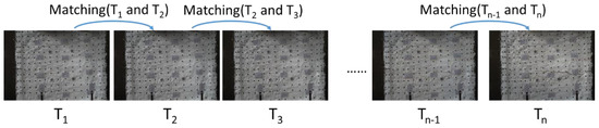 To enable subsequent time-series analysis and compare changes at the same points over time, this study established the displacement of the same feature points across images captured at different time intervals, thereby constructing time-series image coordinate sequences for these points. Image matching techniques were employed to track the positions of identical wall points in images captured at different times (Figure 3). The primary goal was to extract the image coordinates of specific feature points across varying time steps and viewpoints, thus establishing consistent point correspondences as a foundation for deformation analysis. Image matching is a crucial technique to identify corresponding points between image pairs at different times.