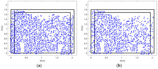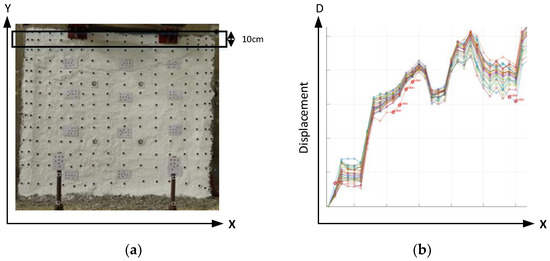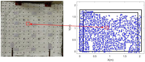 This study focused on removing outliers in data containing noise and abnormal values. MAD is calculated by first determining the median of the dataset within a predefined region. Then, the absolute deviation of each value from this median is computed. Finally, the median of these absolute deviations is taken. MAD offers greater stability than mean absolute deviation when filtering noisy data with outliers. Therefore, MAD was selected for outlier detection in this analysis. The calculation procedure involved determining the median of the data, computing the absolute differences between each data point and the median, and then using the median of these differences as the MAD value (Equations (9) and (10)). By setting a threshold based on MAD, points with 3D displacements exceeding this range were identified as outliers and removed. This step helped eliminate outliers in SURF-derived feature points in the spatial domain. To define the working region, considering that crack development in walls under loading typically propagates laterally (X direction) with a gradual increase in displacement, the data were segmented horizontally along the Y direction (vertical) into 10 cm intervals. Outlier detection and removal were performed within each region to filter local noise (Figure 4) effectively. Furthermore, for more complex geometries or multi-axial stress states this assumption may not hold, and in such cases the filtering region or computation range may need to be adjusted.
