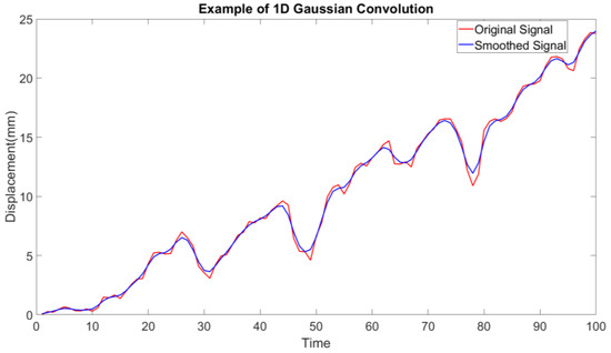 This study applied 1D Gaussian convolution in the time domain to filter displacements of the same point across different time steps. One-Dimensional convolution is commonly used for smoothing time-series data; it effectively suppresses sudden displacement spikes or anomalous variations caused by image matching errors. To address such issues, this study applied 1D Gaussian smoothing convolution to the 3D coordinates of each feature point along the time axis, thus reducing the impact of matching errors on deformation analysis. The method uses a Gaussian distribution function as the convolution kernel. In this method, a kernel width that covers approximately three standard deviations (typically corresponding to about four time steps on either side) is selected. This design emphasizes the influence of neighboring time steps, helping eliminate short-term unreasonable displacement fluctuations while preserving the overall deformation trend.