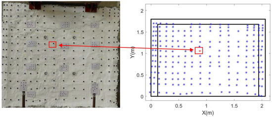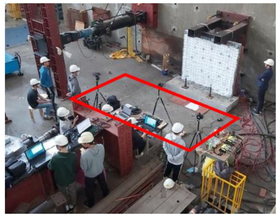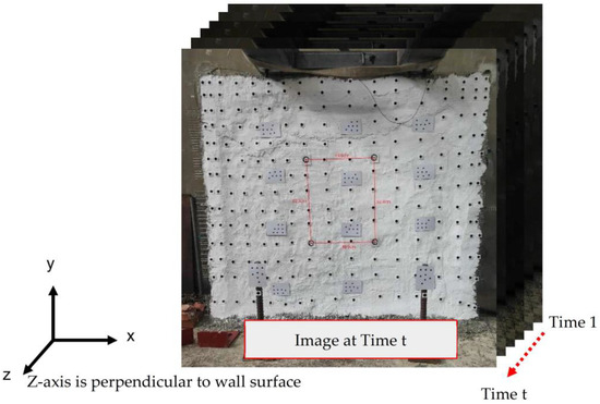 An artificial marker refers to a black circular target placed on a white background. It is manually distributed uniformly across the wall surface. Their high contrast facilitates the clear identification of the circle centroids, which are used as feature points to observe wall deformation under different loading conditions. A key advantage of these circular markers is their ability to provide stable centroid extraction from multiple camera viewpoints, thus enhancing the consistency of feature point tracking across time-series images.
