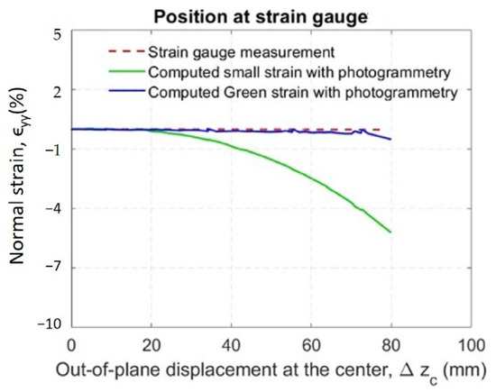 While the local deformation may appear moderate, the overall rigid-body out-of-plane displacement was not negligible, particularly as the wall approached failure. This rigid-body motion contributes to differences between the Green–Lagrange and engineering strain formulations. An example comparing the Green–Lagrange and engineering strain fields of the tested specimen is shown in Figure 27.