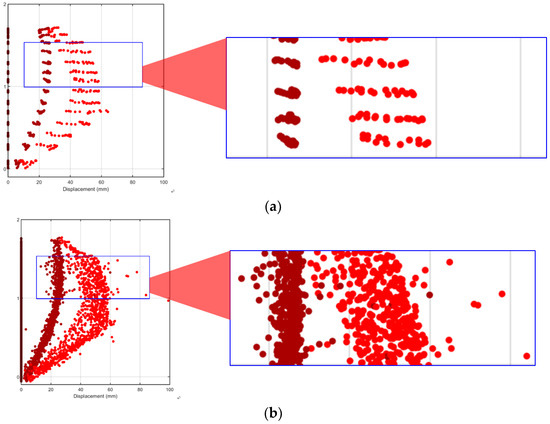 To improve data quality, MAD filtering (Figure 16c) was first applied to the displacement data; the results clearly demonstrated the method’s effectiveness. For example, at time step 90—before any visible cracking or large deformation had developed—the outliers were already removed effectively. However, methods that used only 1D convolution smoothing (Figure 16d) or representative point selection (Figure 16e) showed that while these approaches reduced local noise, they faced limitations in addressing significant outliers if such values were not first removed. Nevertheless, both smoothing and resampling remain necessary steps for strain computation, and their roles will be further explained in the strain analysis section.
