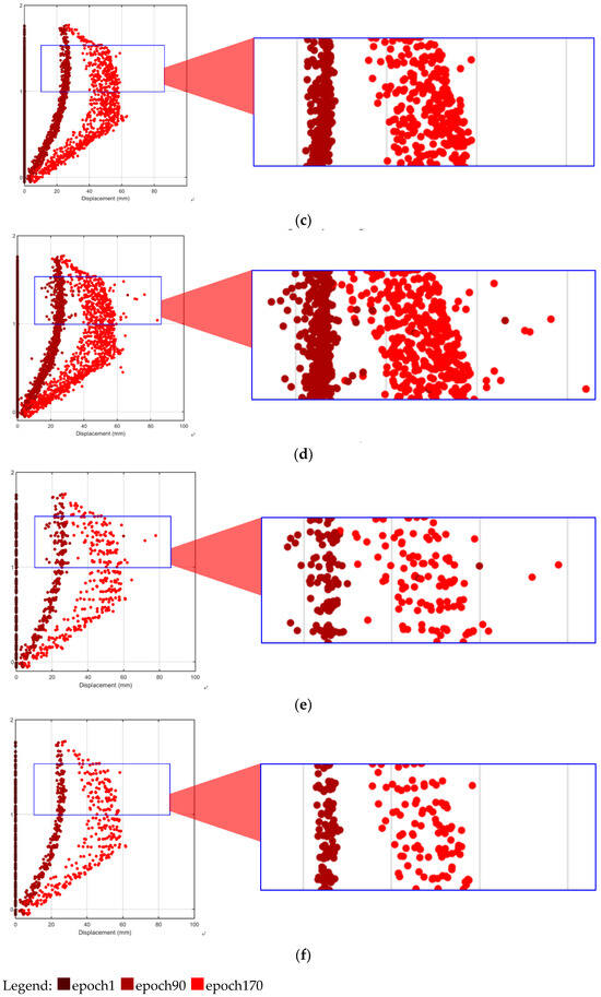 Spatio-temporal filtering for targetless displacement in side view (Y-Z profile): (a) displacements at 1, 90, and 170 epochs (target method); (b) displacements at 1, 90, and 170 epochs (targetless method); (c) results of MAD filtering only (targetless method); (d) results of 1D convolution smoothing only (targetless method); (e) results of representative point selection only (targetless method); and (f) results of the spatio-temporal filtering process (targetless method).