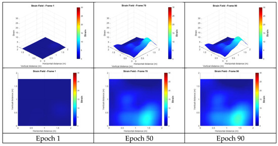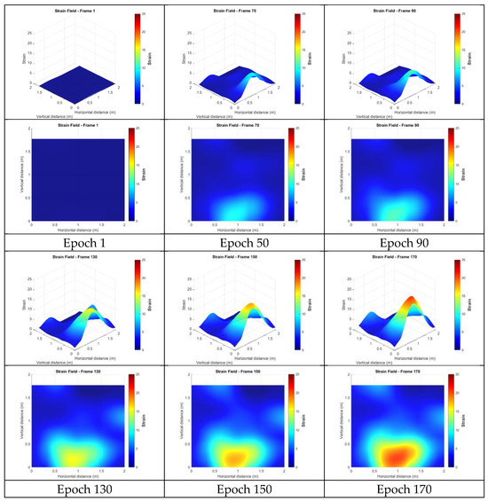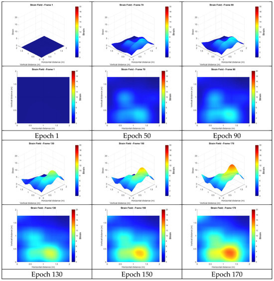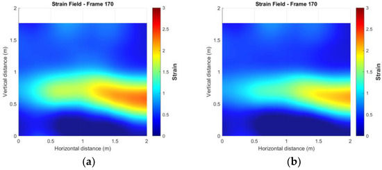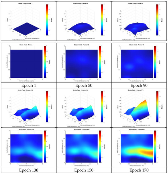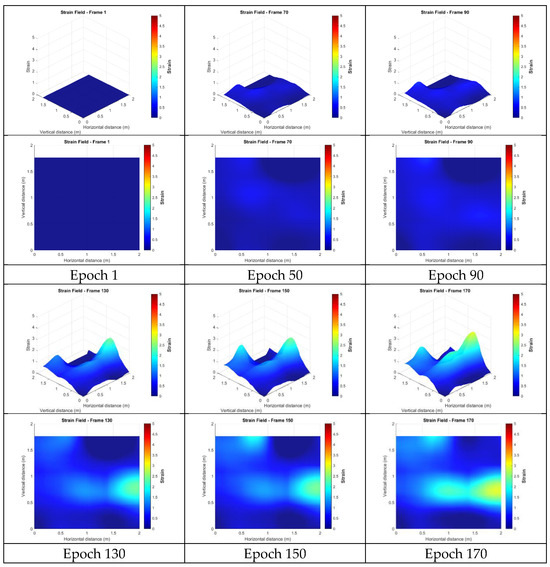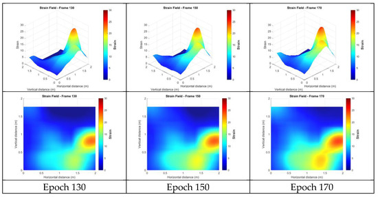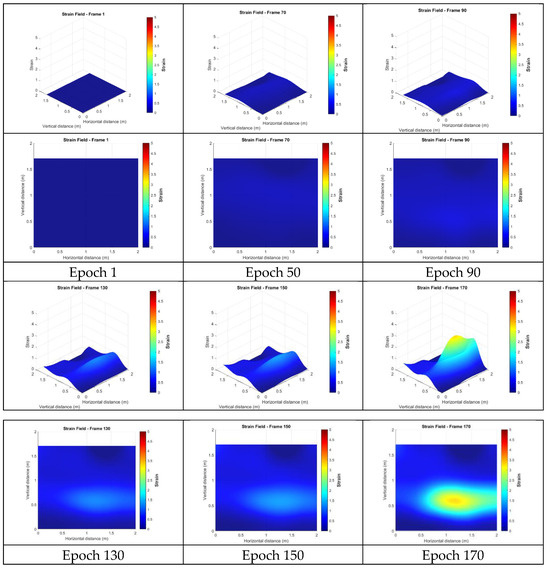 This section presents the strain fields calculated from the targetless-derived 3D points before any filtering was applied. Figure 18 illustrates the strain distributions at epochs 1, 50, 90, 130, 150, and 170. In these figures, red indicates regions of high strain, while blue represents low strain. The results revealed broad, high-strain distributions along the right side and lower edge of the wall, characterized by multiple localized peaks. This pattern suggests that damage may have occurred in these regions, potentially indicating significant cracking on the right side or separation from the surrounding concrete frame. However, the wide distribution and numerous peaks made it challenging to identify precise crack locations. Additionally, a smaller region of high strain was observed in the upper left, potentially indicating damage or separation from the upper concrete frame. The remaining upper areas lacked sufficient feature points, making it hard to confirm whether similar damage occurred in those regions.