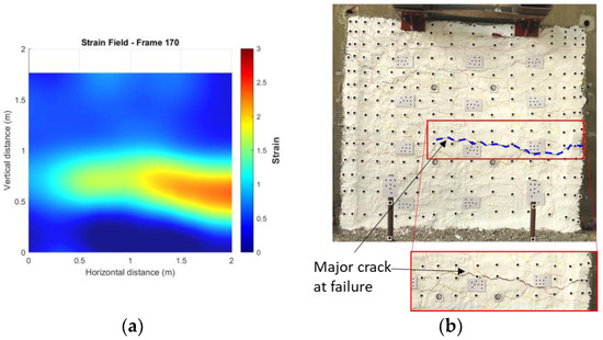 Comparison of strain and crack in image: (a) strain of filtered targetless data and (b) post-cracking image.