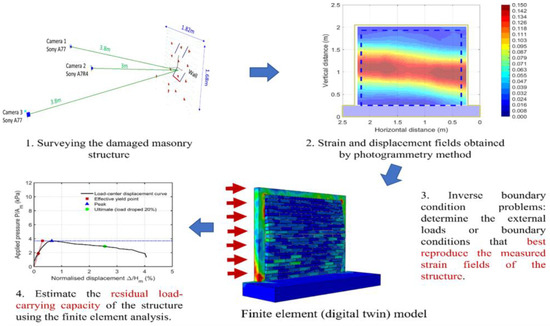 Future research directions may include evaluating alternative feature detection and matching algorithms to reduce the impact of lighting variations and enhance point stability, and testing the generalizability of the method across different structural materials and configurations under similar loading conditions; we consider the integration of measured strain fields with finite-element models to be the most important step toward practical deployment. This integration enables not only damage localization but also estimation of the residual load-carrying capacity of structures, which helps provide a more comprehensive understanding of crack initiation and propagation mechanisms. Accordingly, a conceptual workflow has been added to illustrate (Figure 28) how the measured strain fields can be incorporated into FE models for both capacity assessment and damage localization.