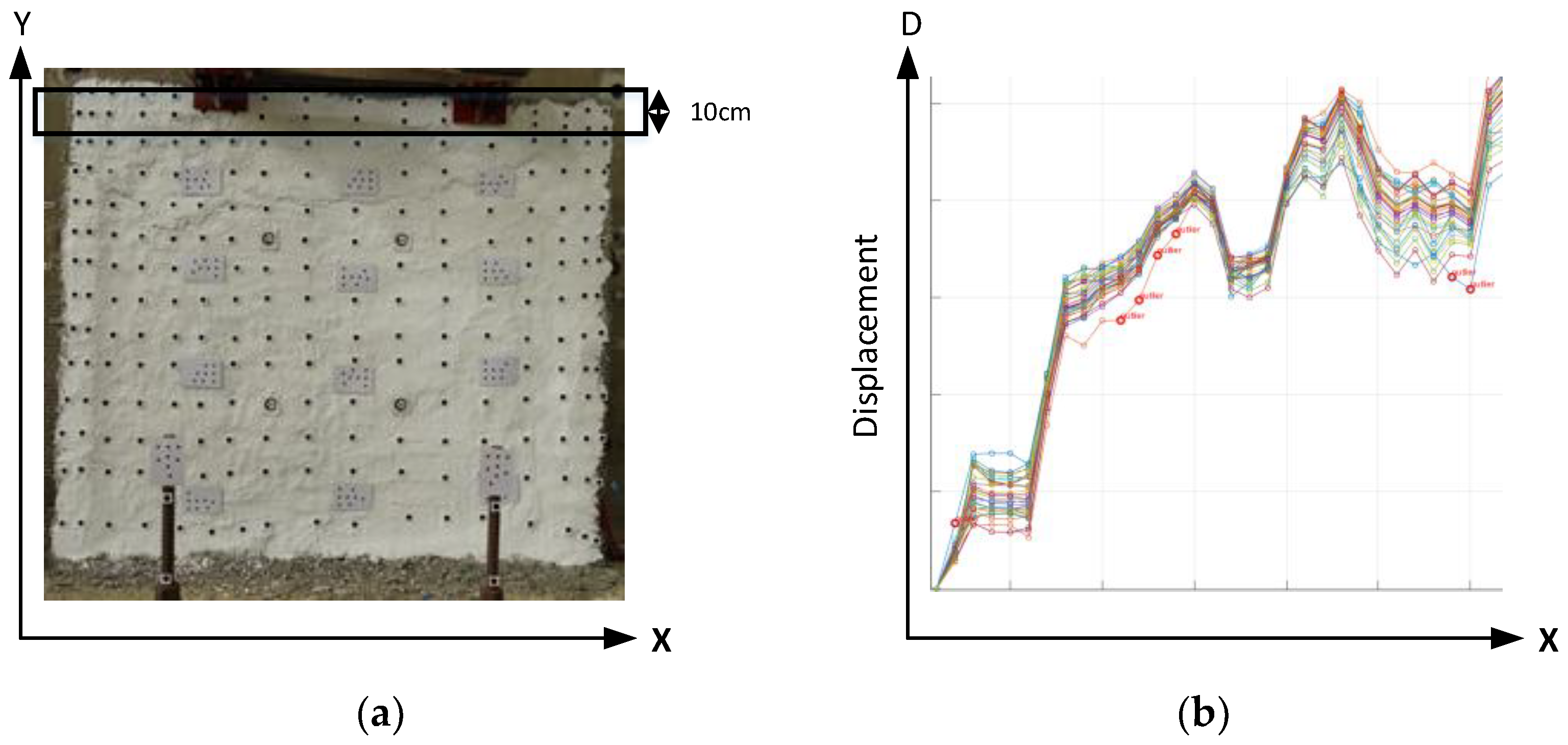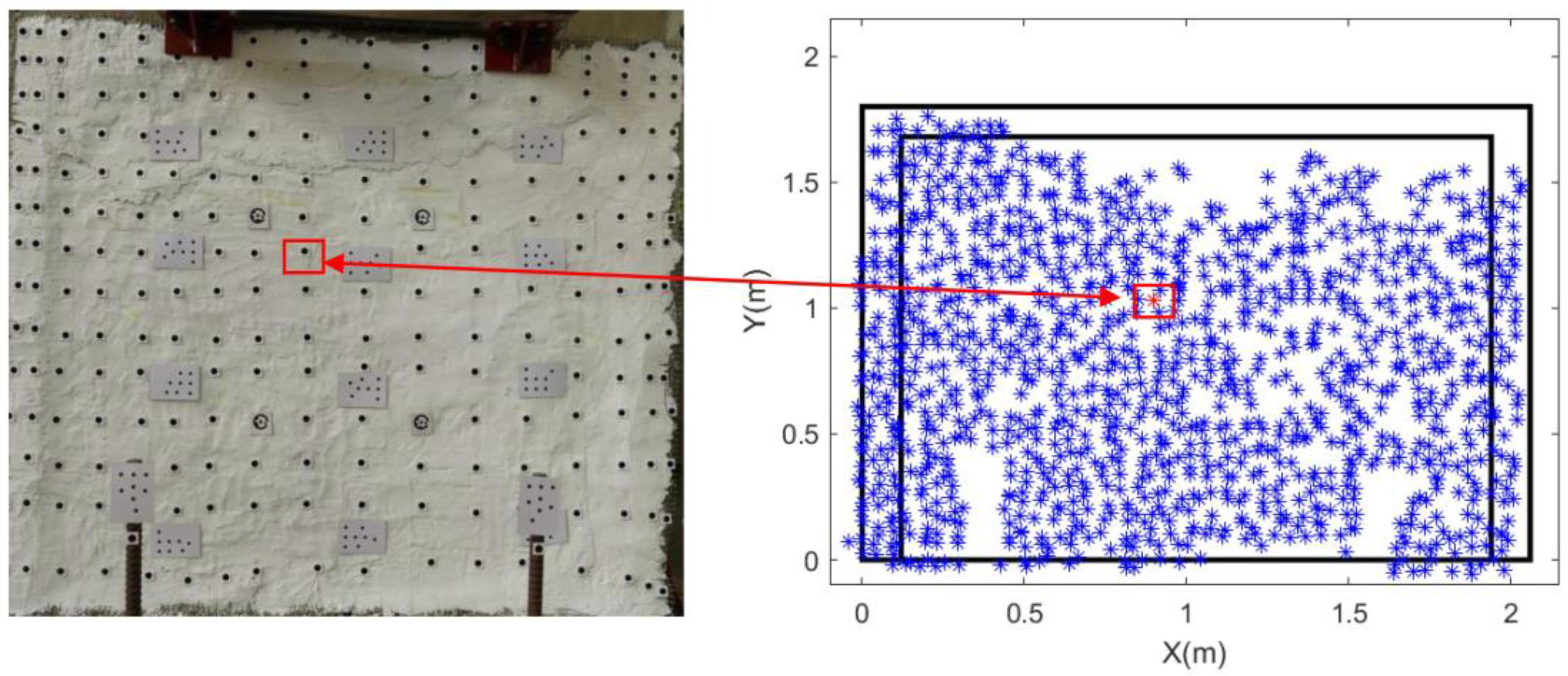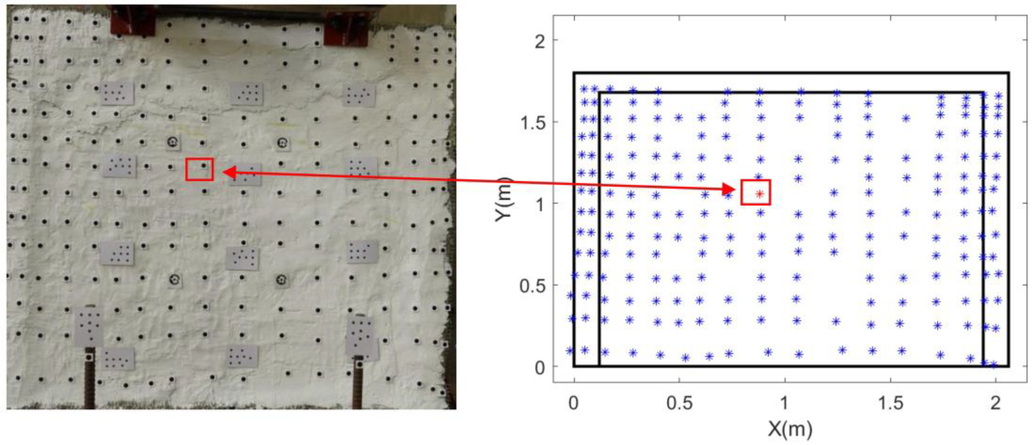 - Marker-based feature points: Artificial targets in the form of black circular markers were manually applied to the wall surface. The centroids of these circles were extracted as precise feature point locations. This approach offers the advantages of uniform distribution and well-defined, easily identifiable points.