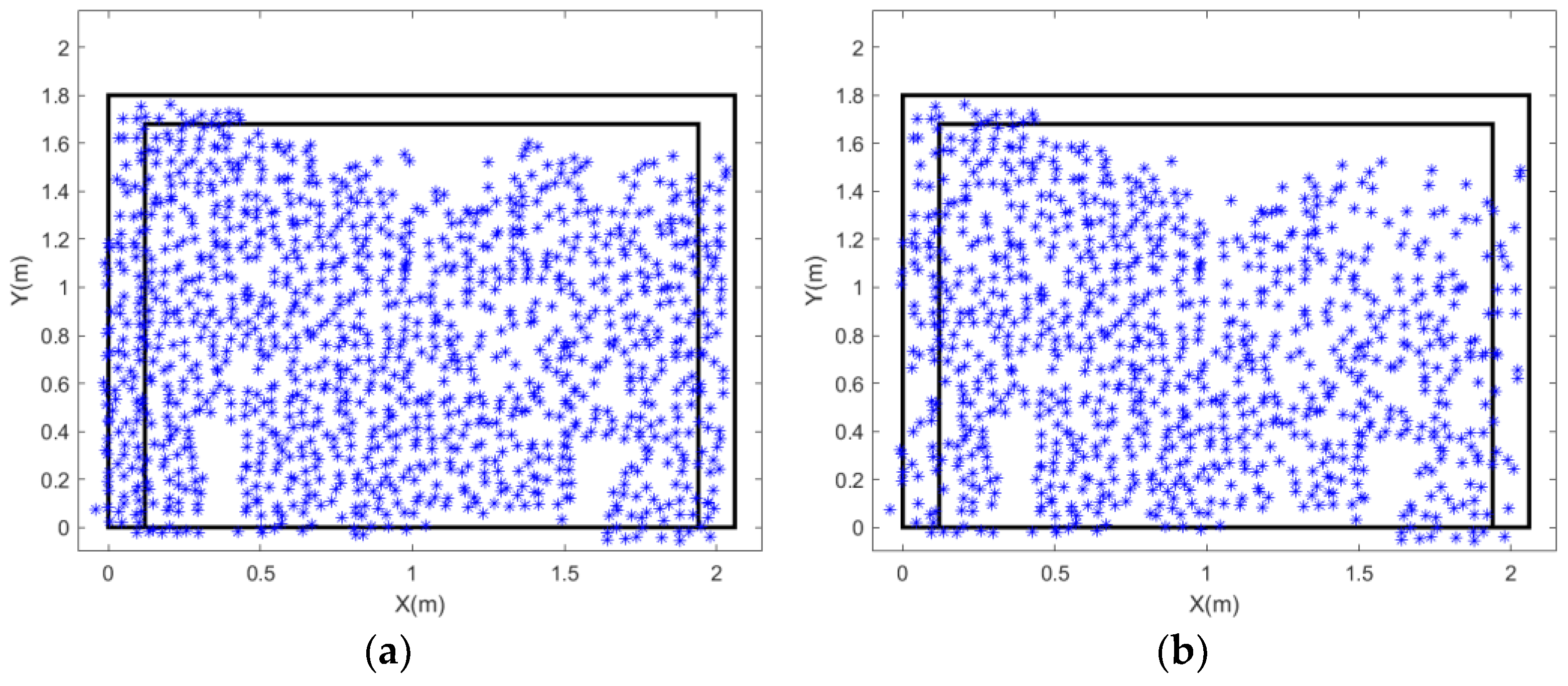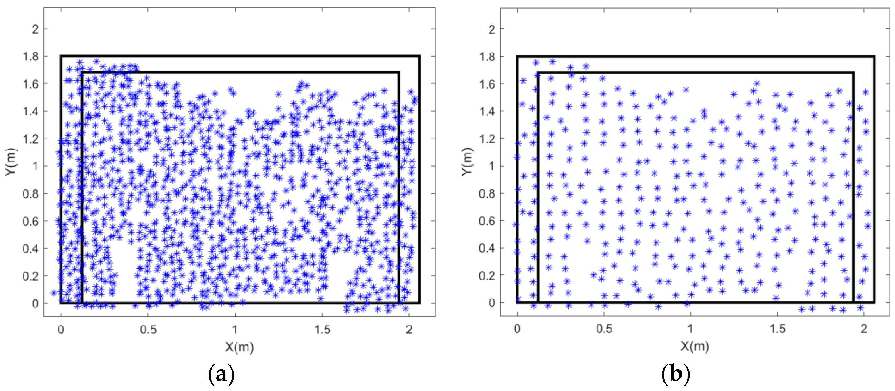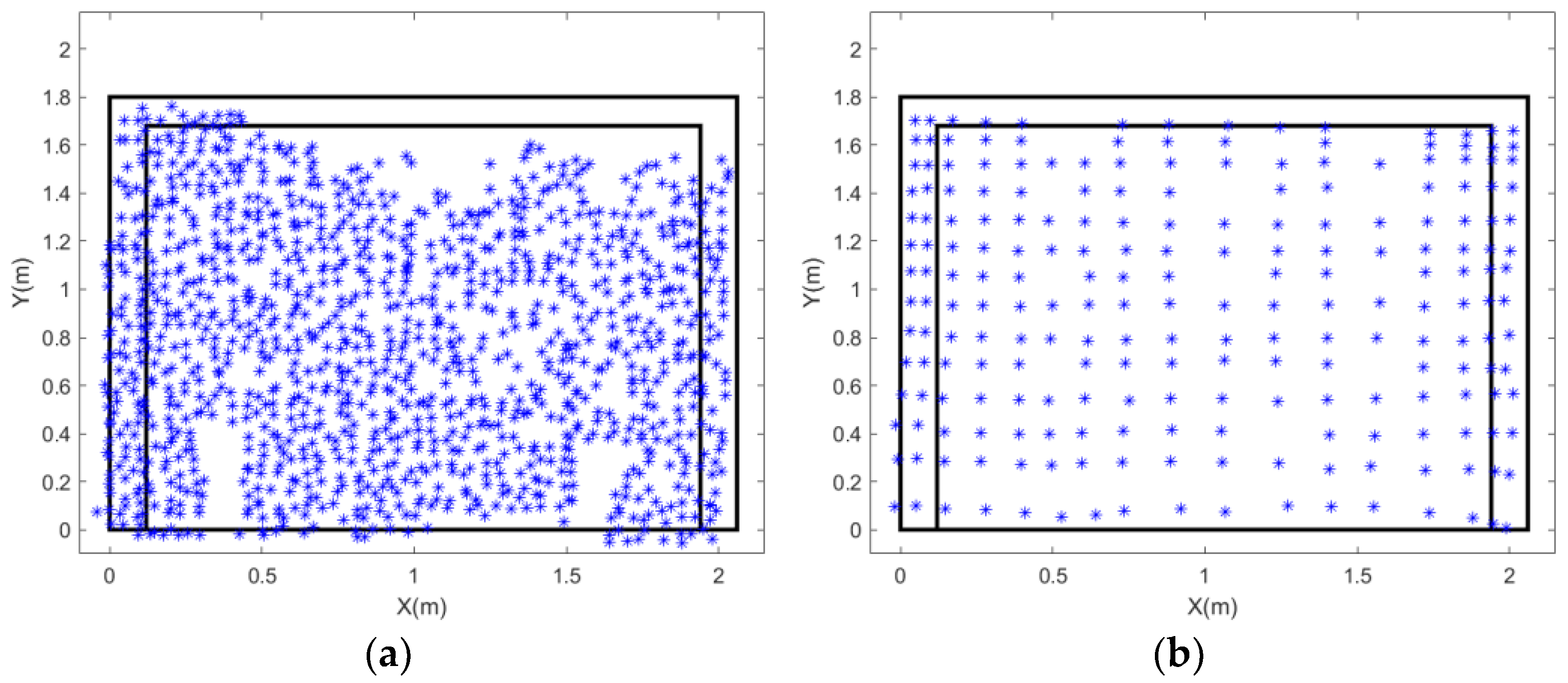 - Marker-based feature points: Artificial targets in the form of black circular markers were manually applied to the wall surface. The centroids of these circles were extracted as precise feature point locations. This approach offers the advantages of uniform distribution and well-defined, easily identifiable points.