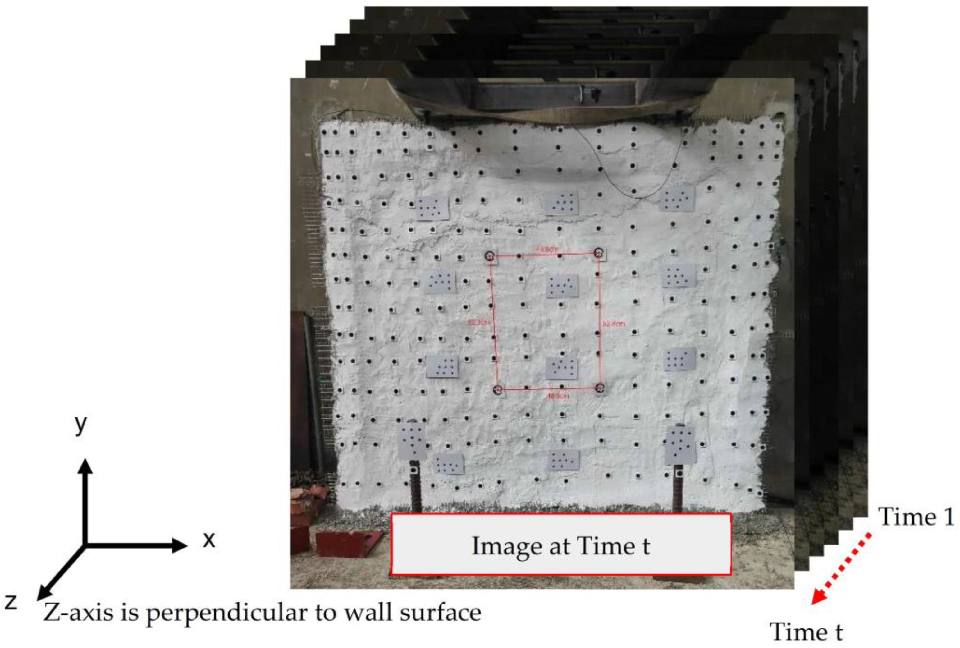 - Experimental demonstration of method effectiveness: The study experimentally demonstrates the feasibility, accuracy, and improved computational efficiency of the proposed markerless approach through full-scale testing on a masonry wall under controlled loading, providing a reliable and efficient non-contact alternative for monitoring structural deformation in civil engineering applications.