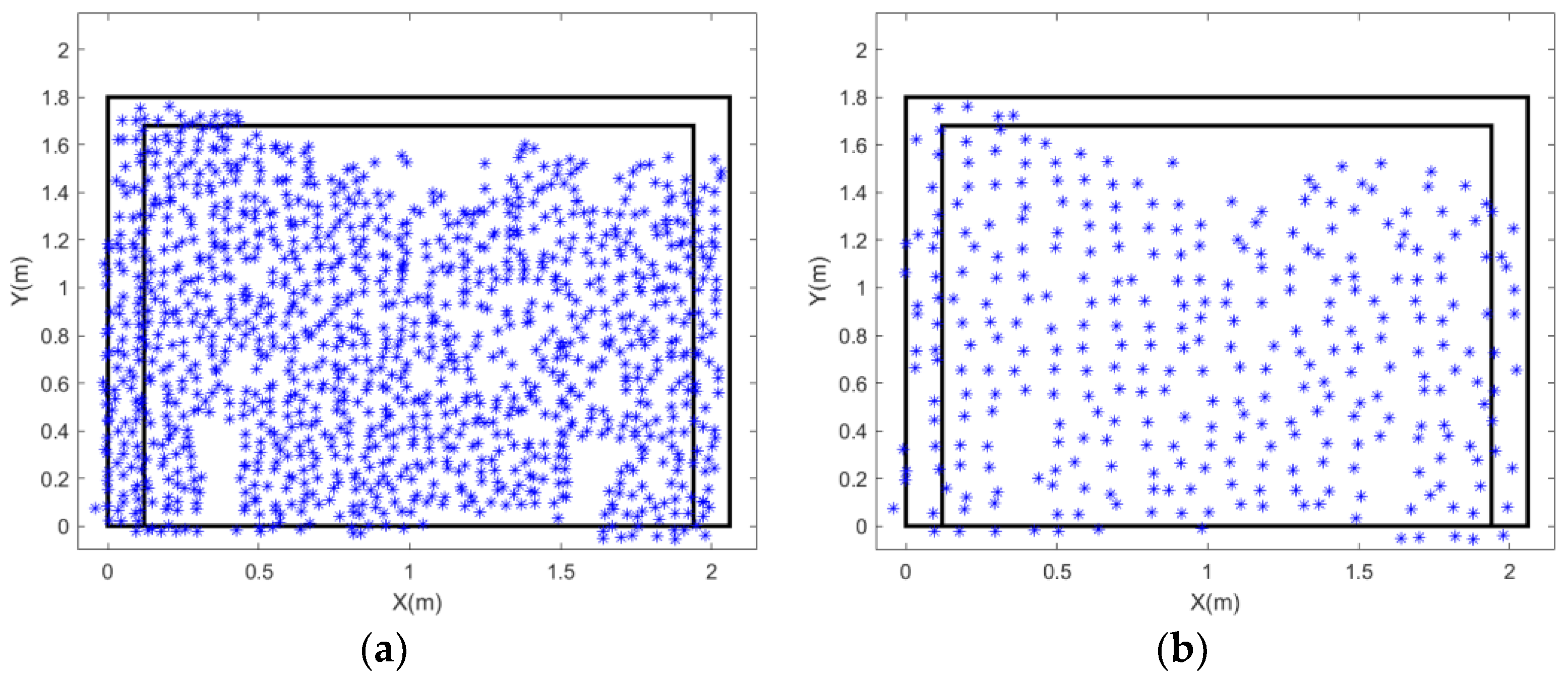 - Algorithm-derived feature points: The Speeded-Up Robust Features (SURF) [20] algorithm was used to detect keypoint descriptors directly from the images. This method does not require physical markers on the wall and can generate a much higher density of feature points compared to the artificial targets.